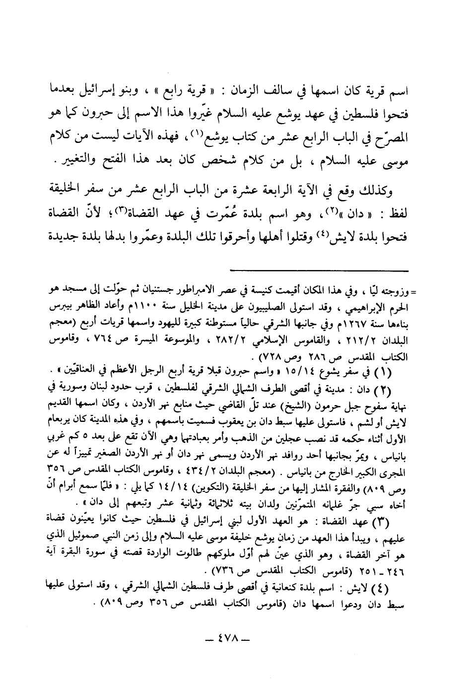 اسم قرية كان اسمها في سالف الزمان (قرية رابع) ، وبنو إسرائيل بعد ما فتحوا فلسطين في عهد يوشع عليه السلام غيّروا هذا الاسم إلى حبرون، كما هو المصرح في الباب الرابع عشر من كتاب يوشع، فهذه الآيات ليست من كلام موسى عليه السلام، بل من كلام شخص كان بعد هذا الفتح والتغيير، وكذلك وقع في الآية الرابعة عشرة من الباب الرابع عشر من سفر الخليقة لفظ (دان) وهو اسم بلدة عمّرت في عهد القضاة لأن بني إسرائيل بعد موت يوشع عليه السلام في عهد القضاة فتحوا بلدة ليث، وقتلوا أهلها وأحرقوا تلك البلدة وعمروا بدلها بلدة جديدة