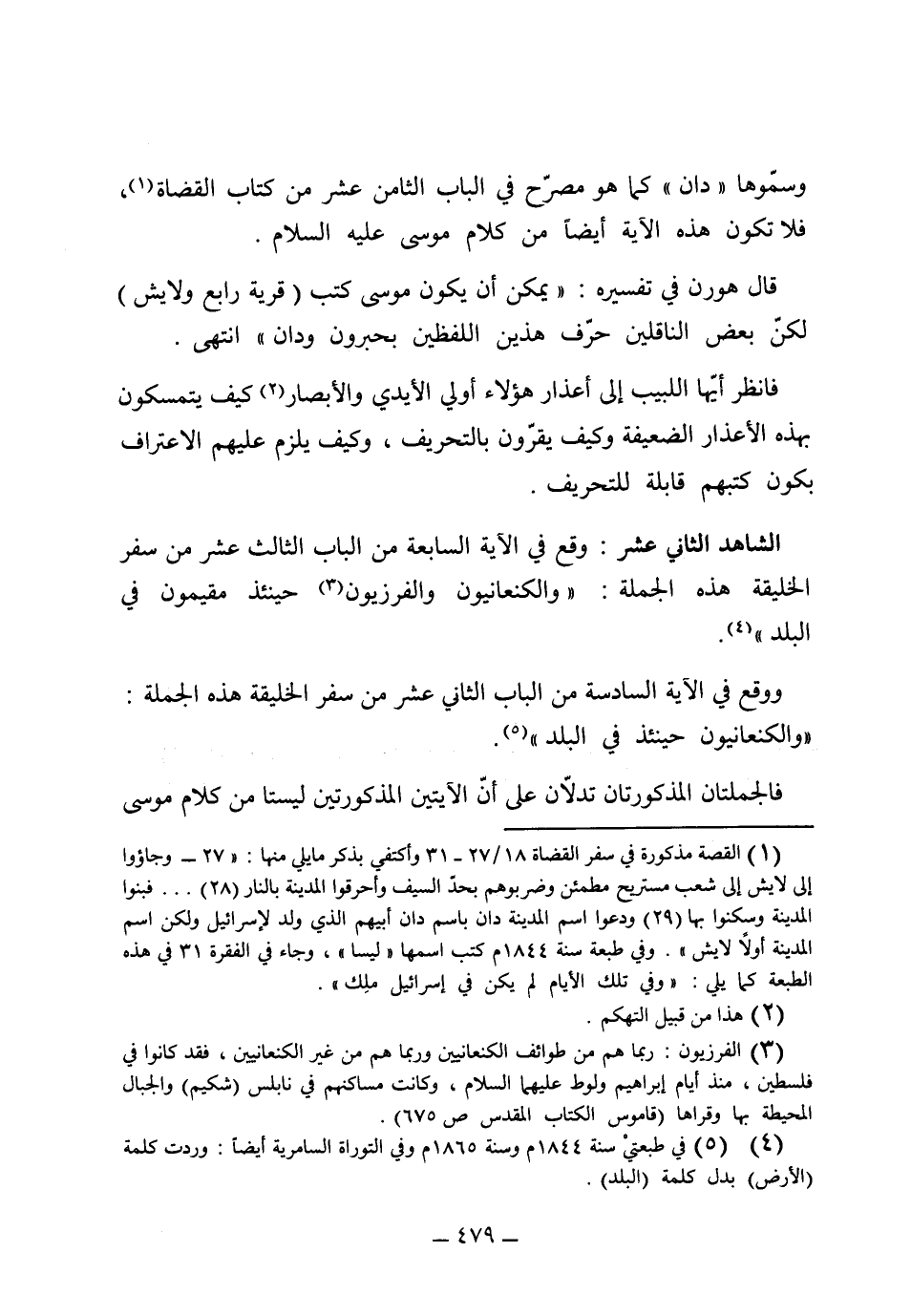 وسموها دان، كما هو مصرح في الباب الثامن عشر من كتاب القضاة، فلا تكون هذه الآية أيضاً من كلام موسى عليه السلام، قال هورن في تفسيره: "يمكن ان يكون موسى كتب قرية رابع وليث، لكن بعض الناقلين حرّف هذين اللفظين بحبرون ودان" فانظر أيها اللبيب إلى أعذار هؤلاء أولي الأيدي والأبصار كيف يتمسكون بهذه الأعذار الضعيفة، وكيف يقرُّون بالتحريف وكيف يلزم عليهم الاعتراف بكون كبتهم قابلة للتحريف.