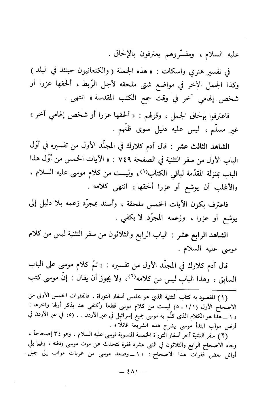 (الشاهد الثالث عشر) قال آدم كلارك في المجلد الأول من تفسيره في أول الباب الأول من سِفْر الاستثناء في الصفحة 749: "الآيات الخمس من أول هذا الباب بمنزلة المقدمة لباقي الكتاب وليست من كلام موسى عليه السلام والأغلب ان يوشع أو عزرا ألحقها" فاعترف بكون الآيات الخمسة ملحقة، وأسند بمجرد زعمه بلا دليل إلى يوشع أو عزرا وزعمه المجرد لا يكفي.