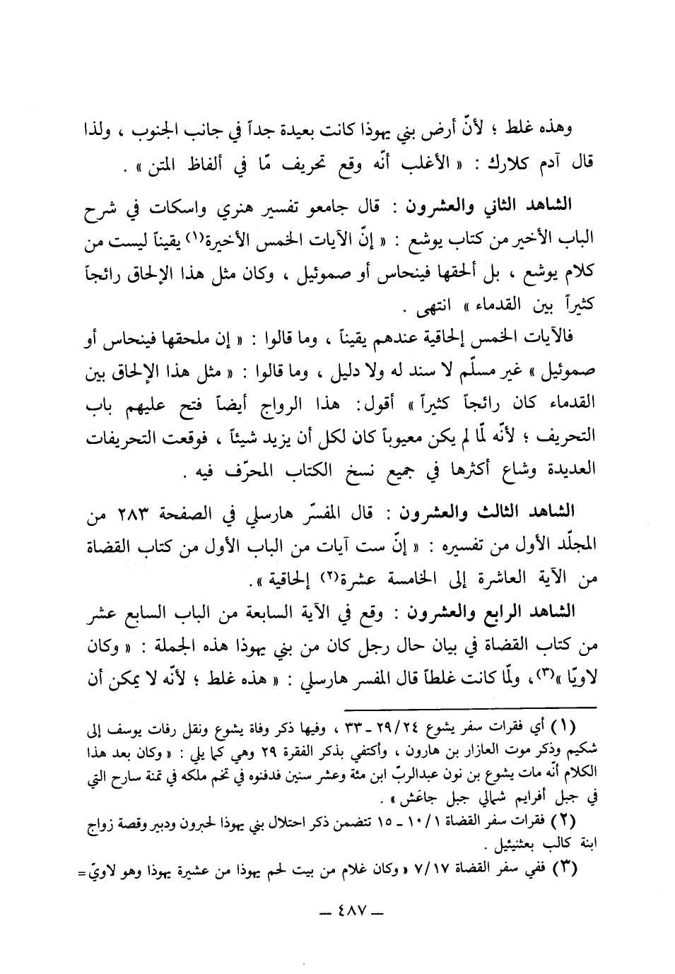 (الشاهد الثالث والعشرون) قال المفسر هارسلي في الصفحة 283 من المجلد الأول من تفسيره إن ست أيات من الباب الأول من كتاب القضاة من الآية العاشرة إلى الخامسة عشرة إلحاقية.