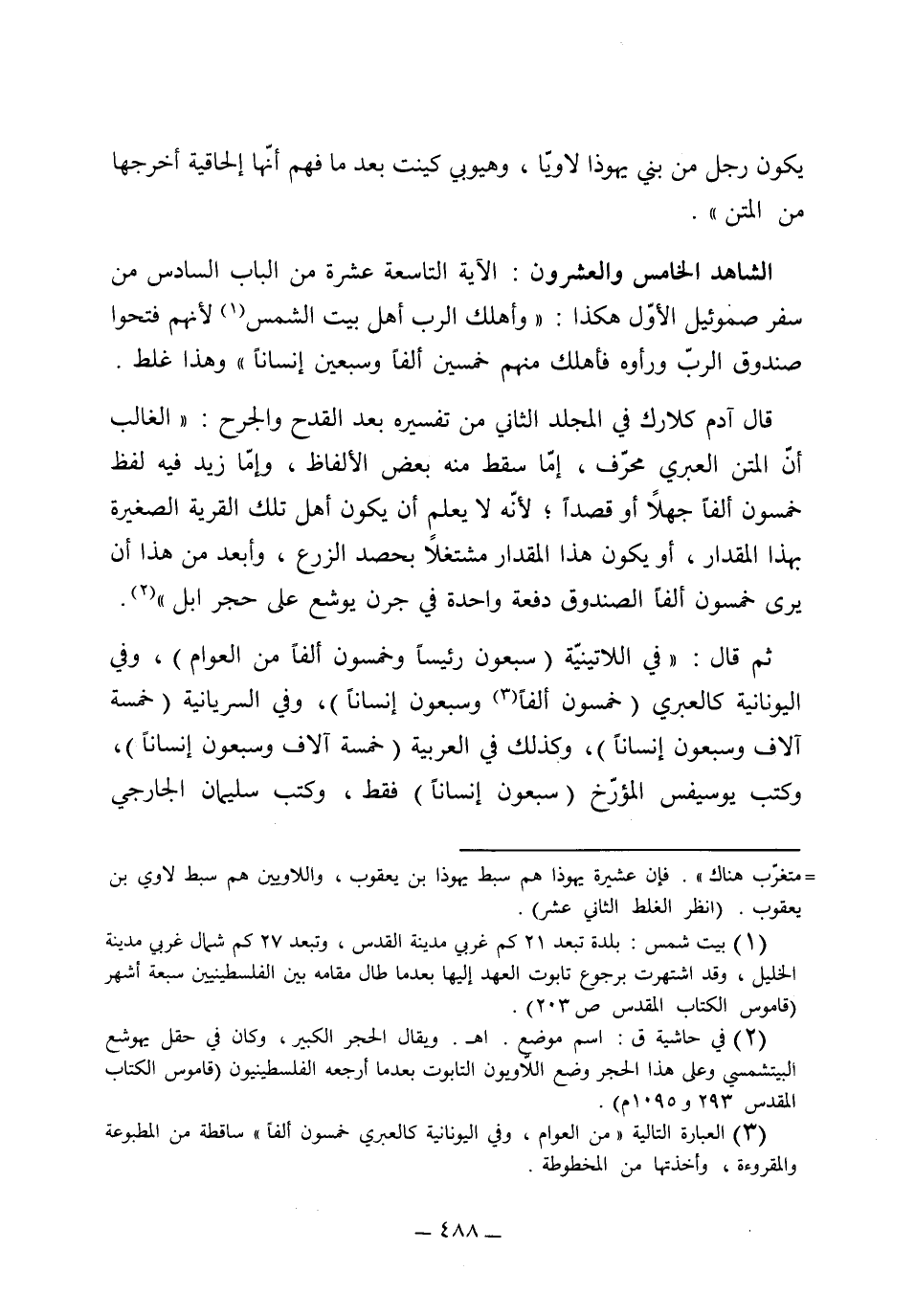 (الشاهد الخامس والعشرون) الآية التاسعة عشرة من الباب السادس من سفر صموئيل الأول هكذا: "وأهلك الرب أهل بيت الشمس، لأنهم فتحوا صندوق الرب ورأوه فأهلك منهم خمسين ألفاً وسبعين إنساناً" وهذا غلط. قال آدم كلارك في المجلد الثاني من تفسيره بعد القَدْح والجَرْح: "الغالب أن المتن العبري محرَّف إما سقط منه بعضُ الألفاظ وإما زيد فيه لفظ خمسون ألفاً جهلاً أو قصداً لأنه لا يعلم أن يكون أهل تلك القرية الصغيرة بهذا المقدار، أو يكون هذا المقدار مشتغلاً بحصد الزرع، وأبعد من هذا أن يرى خمسون ألفاً الصندوق دفعة واحدة في جرن يوشع على حَجَرا بل" ثم قال: "في اللاطينية سبعون رئيساً، وخمسون ألفاً، وسبعون إنساناً، وفي السريانية خمسة آلاف وسبعون إنساناً، وكذلك في العربية خمسة آلاف وسبعون إنساناً، وكتب المؤرخ سبعون إنساناً فقط، وكتب سليمان الجارجي