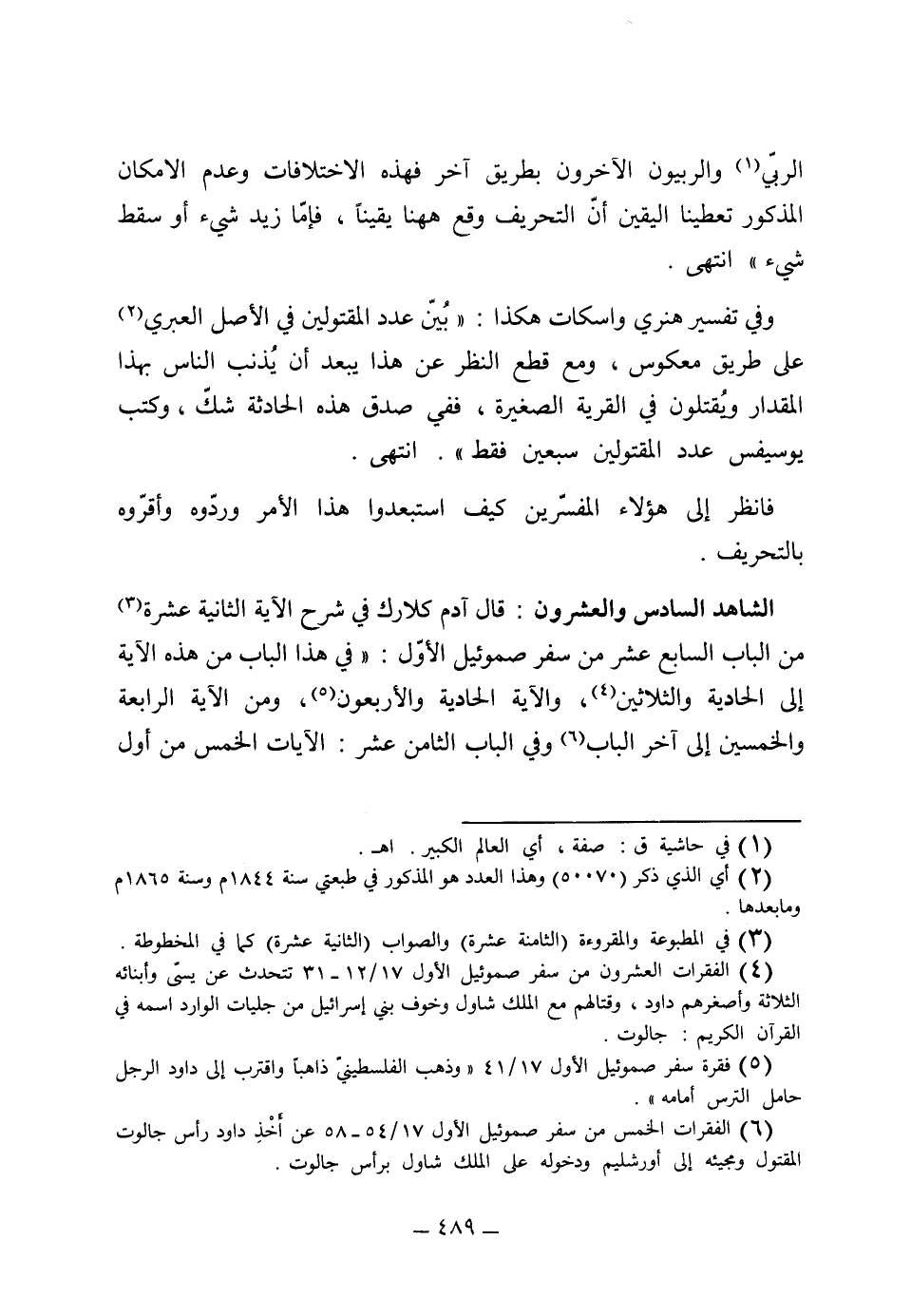 (الشاهد السادس والعشرون) قال آدم كلارك في شرح الآية الثامنة عشرة من الباب السابع عشر من سفر صموئيل الأول: "في هذا الباب من هذه الآية إلى الحادية والثلاثين والآية الحادية والأربعون، ومن الآية الرابعة والخمسين إلى آخر الباب، وفي الباب الثامن عشر الآيات الخمس من أول