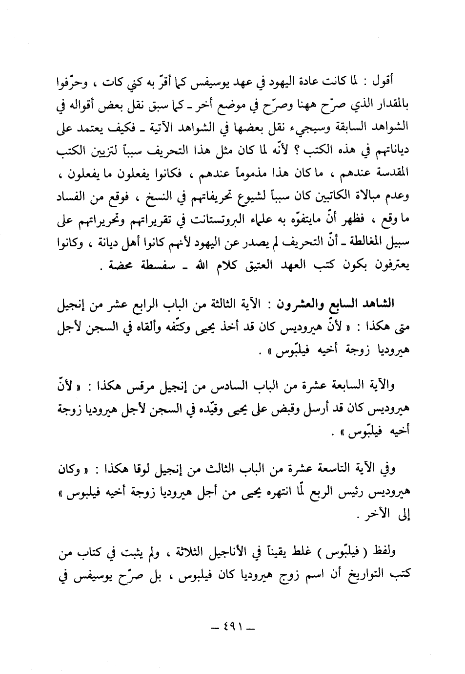 (الشاهد السابع والعشرون) الآية الثالثة من الباب الرابع عشر من إنجيل متى هكذا: "لأن هيروديس كان قد أخذ يحيى وكتفه وألقاه في السجن لأجل هيروديا زوجة أخيه فيلبوس" والآية السابعة عشرة من الباب السادس من إنجيل مرقس هكذا: "لأن هيروديس كان قد أرسل وقبض على يحيى وقيده في السجن لأجل هيروديا زوجة أخيه فيلبوس" في الآية التاسعة عشرة من الباب الثالث من إنجيل لوقا هكذا: "وكان هيروديس رئيس الربع لما انتهره يحيى من أجل هيروديا زوجة أخيه فيلبوس" إلى الآخر، ولفظ فيلبوس غلط يقيناً في الأناجيل الثلاثة، ولم يثبت في كتاب من كتب التواريخ أن اسم زوج هيروديا كان فيلبوس، بل صرح