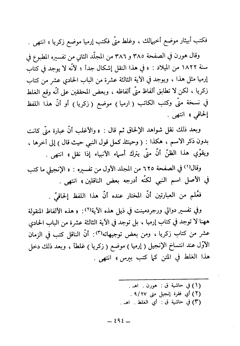 فكتب أبيثار موضع أخي ملك، وغلط متى فكتب أرمياء موضع زكريا"، وقال هورن في الصفحة 385 و 386 من المجلد الثاني من تفسيره المطبوع في سنة 1822 من الميلاد: "في هذا النقل إشكال جداً لأنه لا يوجد في كتاب أرمياء مثل هذا، ويوجد في الآية الثالثة عشرة من الباب الحادي عشر من كتاب زكريا، لكن لا يطابق ألفاظ متى ألفاظه، وبعض المحققين على أنه وقع الغلط في نسخة متى، وكتب الكاتب أرمياء موضع زكريا، أو أن هذا اللفظ إلحاقي" وبعد ذلك نقل شواهد الإلحاق ثم قال: "والأغلب أن عبارة متى كانت بدون ذكر الاسم هكذا وحينئذ كمل قول النبي حيث قال إلى آخرها ويقوي هذا الظن أن متى يترك أسماء الأنبياء إذا نقل" وقال في الصفحة 625 من المجلد الأول من تفسيره: "الإنجيلي ما كتب في الأصل اسم النبي لكنه أدرجه بعض الناقلين" فعلم من العبارتين أن المختار عنده