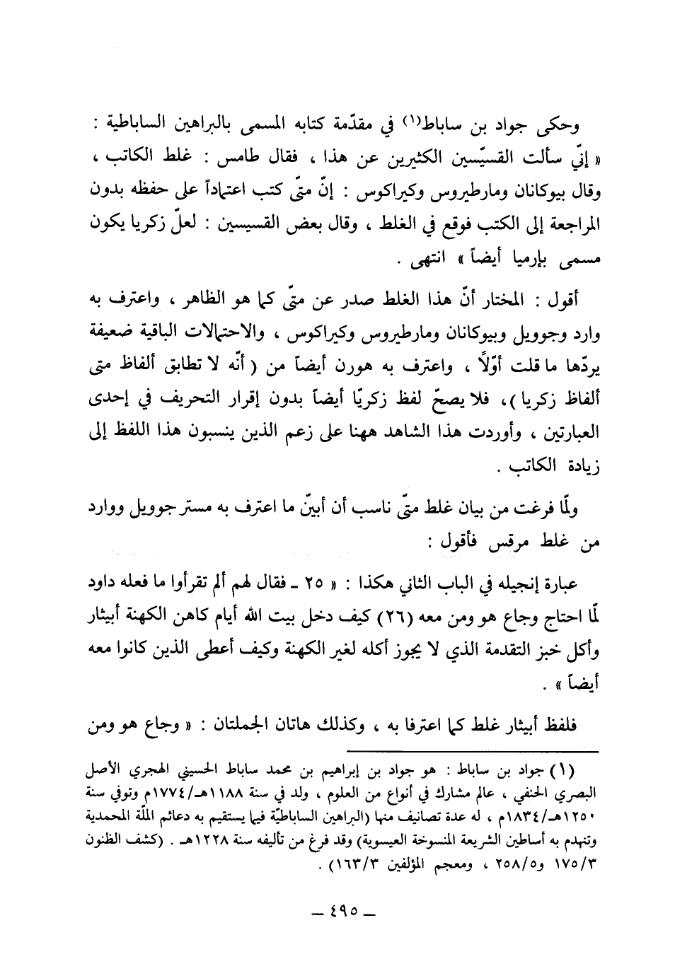 وحكى جواد بن ساباط في مقدمة كتابه المسمى بالبراهين الساباطية: "إني سألت القسيسين الكثيرين عن هذا فقال طامن: غلط الكاتب، وقال بيوكانان ومارطيروس وكيراكوس.