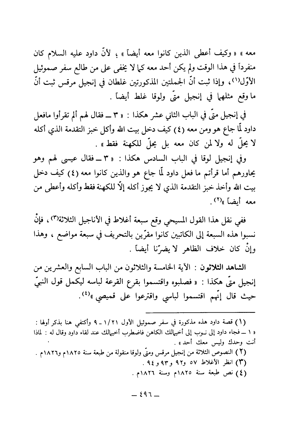 معه" وكيف أعطى الذين كانوا معه أيضاً، لأن داود عليه السلام كان منفرداً في هذا الوقت، ولم يكن أحد معه كما لا يخفى على من طَالَع سفر صموئيل الأول وإذا ثبت أن الجملتين المذكورتين غلطان في إنجيل مرقس ثبت أن ما وقع مثلهما في إنجيل متى ولوقا غلط أيضاً.