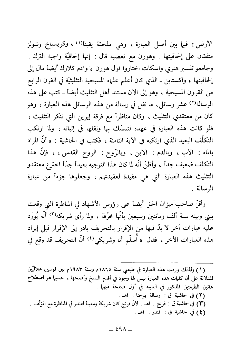 الأرض ثلاثة وهم الروح والماء والدم، وهؤلاء الثلاثة تتحد في واحد" ففي هاتين الآيتين كان أصل العبارة على ما زعم محققوهم هذا القدر: "لأن الشهود الذين يشهدون ثلاثة وهم الروح والماء والدم وهؤلاء الثلاثة تتحد في واحد"، فزاد معتقدو التثليث هذه العبارة "في السماء ثلاثة وهم الأب والكلمة والروح القدس وهؤلاء الثلاثة واحدة والشهود الذين يشهدون في الأرض" فيما بين أصل العبارة وهي ملحقة يقيناً، وكريسباخ وشولز متفقان على إلحاقيتها، وهورن مع تعصبه قال إنها إلحاقية واجبة الترك، وجامعو تفسير هنري واسكات اختاروا قول هورن، وآدم كلارك أيضاً مال إلى إلحاقيتها، وأكستاين الذي كان أعلم العلماء المسيحية التثليثية في القرن الرابع من القرون المسيحية، وهو إلى الآن مستند أهل التثليث أيضاً كتب على هذه الرسالة عشر رسائل، وما نقل في رسالة من هذه الرسائل هذه العبارة، وهو كان من معتقدي التثليث، وكان مناظِراً مع فرقة أيرين التي تنكر التثليث، فلو كانت هذه العبارة في عهده لتمسك بها ونقلها في إثباته، ولما ارتكب التكلف البعيد الذي ارتكبه في الآية الثامنة فكتب في الحاشية: "أن المراد بالماء الأب وبالدم الابن وبالروح الروح القدس" فإن هذا التكلف ضعيف جداً، وأظن أنه لما كان هذا التوجيه بعيداً جداً اخترع معتقدو التثليث هذه العبارة التي هي مفيدة لعقيدتهم وجعلوها جزءاً من عبارة الرسالة، وأقر صاحب ميزان الحق أيضاً على رؤوس الأشهاد في المناظرة التي وقعت بيني وبينه سنة ألف ومائتين وسبعين بأنها محرّفة، ولما رأى شريكه أنه يورد عليه عبارات أخر لا