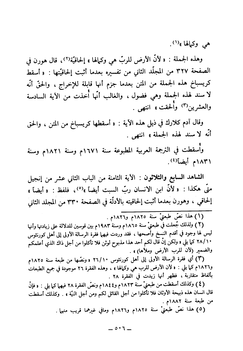هي وكمالها" وهذه الجملة: "لأن الأرض للرب هي وكمالها" إلحاقية، قال هورن في الصفحة 327 من المجلد الثاني من تفسيره بعد ما أثبت إلحاقيتها: "أسقط كريسباخ هذه الجملة من المتن بعد ما جزم أنها قابلة للإخراج، والحق أنها لا سند لهذه الجملة، وهي فضول. والغالب أنها أخذت من الآية السادسة والعشرين وألحقت". وقال آدم كلارك في ذيل هذه الآية: "أسقط كريسباخ من المتن، والحق أنه لا سند لهذه الجملة" وأسقطت في الترجمة العربية المطبوعة سنة 1671 وسنة 1811 وسنة 1831 أيضاً.