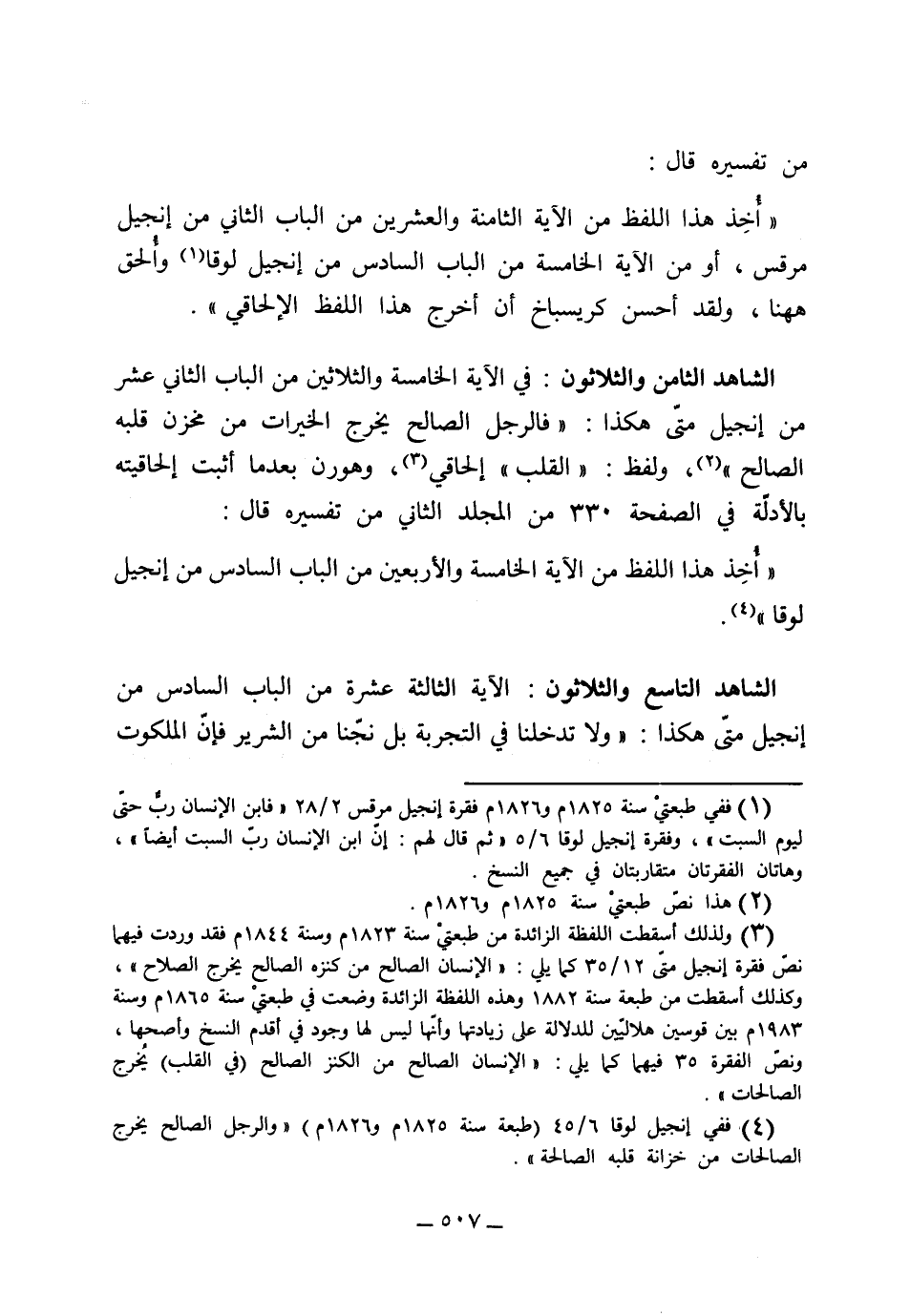 (الشاهد الثامن والثلاثون) في الآية الخامسة والثلاثين من الباب الثاني عشر من إنجيل متَّى هكذا: "فالرجل الصالح يخرج الخيرات من مخزن قلبه الصالح" ولفظ القلب إلحاقي، وهورن بعد ما أثبت إلحاقيته بالأدِّلة في الصفحة 330 من المجلد الثاني