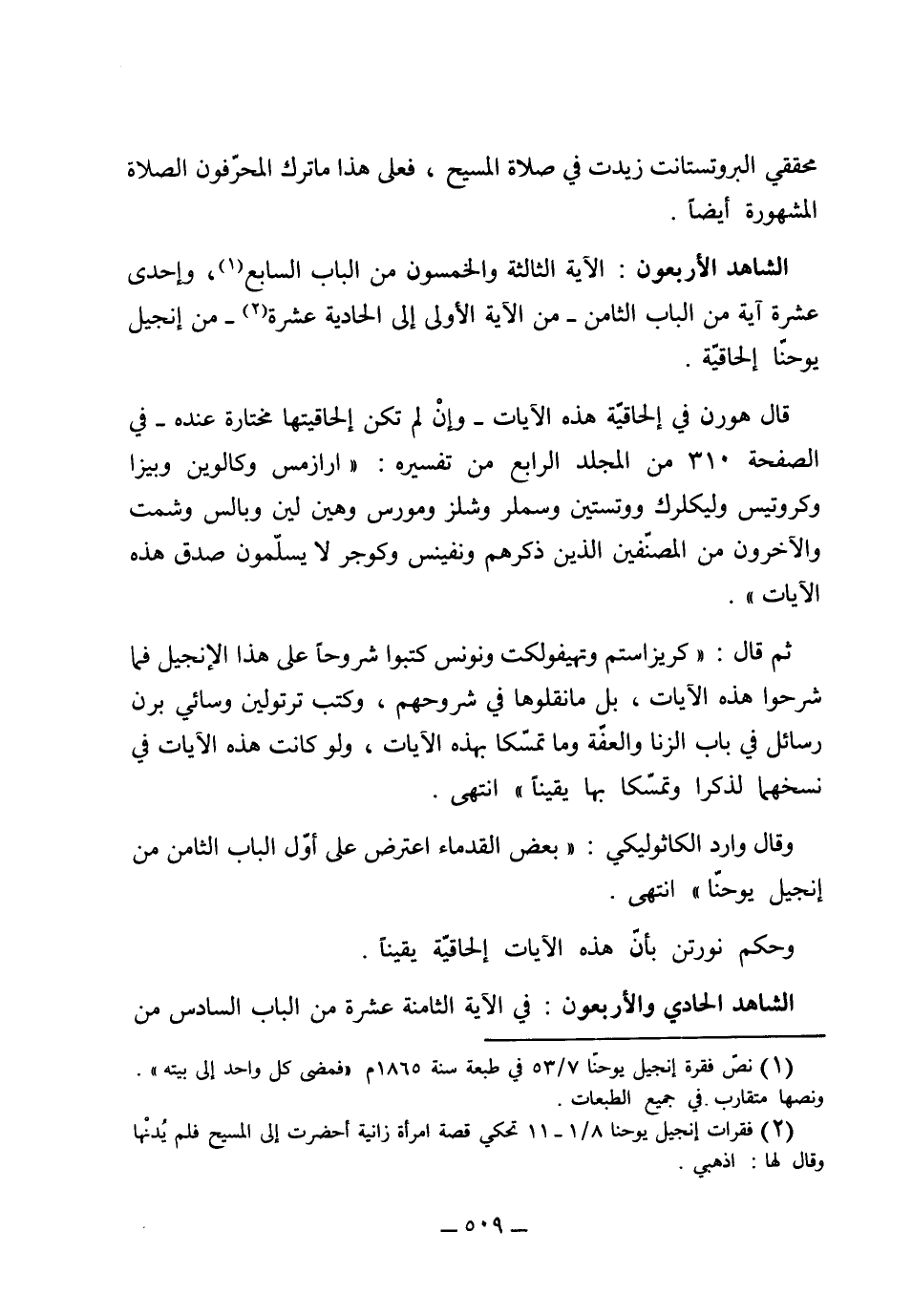 (الشاهد الأربعون) الآية الثالثة والخمسون من الباب السابع، وإحدى عشرة آية من الباب الثامن من الآية الأولى إلى الحادية عشرة من إنجيل يوحنا إلحاقية، قال هورن في إلحاقية هذه الآيات، وإن لم تكن إلحاقيتها مختارة عنده في الصفحة 310 من المجلد الرابع من تفسيره: "أرازمس وكالوين وبيزا وكروتيس وليكرك ووتستين وسملر وشلز ومورس وهين لين وبالس وسمت والآخرون من المصنفين الذين ذكرهم ونفينس وكوجو لا يسلمون صدق هذه الآيات" ثم قال (كرِيزاسُتم وتِهيْوُفِلِكْت ونُونس كتبوا شروحاً على هذا الإنجيل، فما شرحوا هذه الآيات بل ما نقلوها في شروحهم، وكتب ترتولين وساي برن رسائل في باب الزنا والعفة، وما تمسكا بهذه الآيات، ولو كانت هذه الآيات في نسخهما لذكرا أو تمسكا بها يقيناً". وقال وارد كاتلك: "بعض القدماء اعترض على أول الباب الثامن من إنجيل يوحنا" وحكم نورتن بأن هذه الآيات إلحاقية يقيناً.