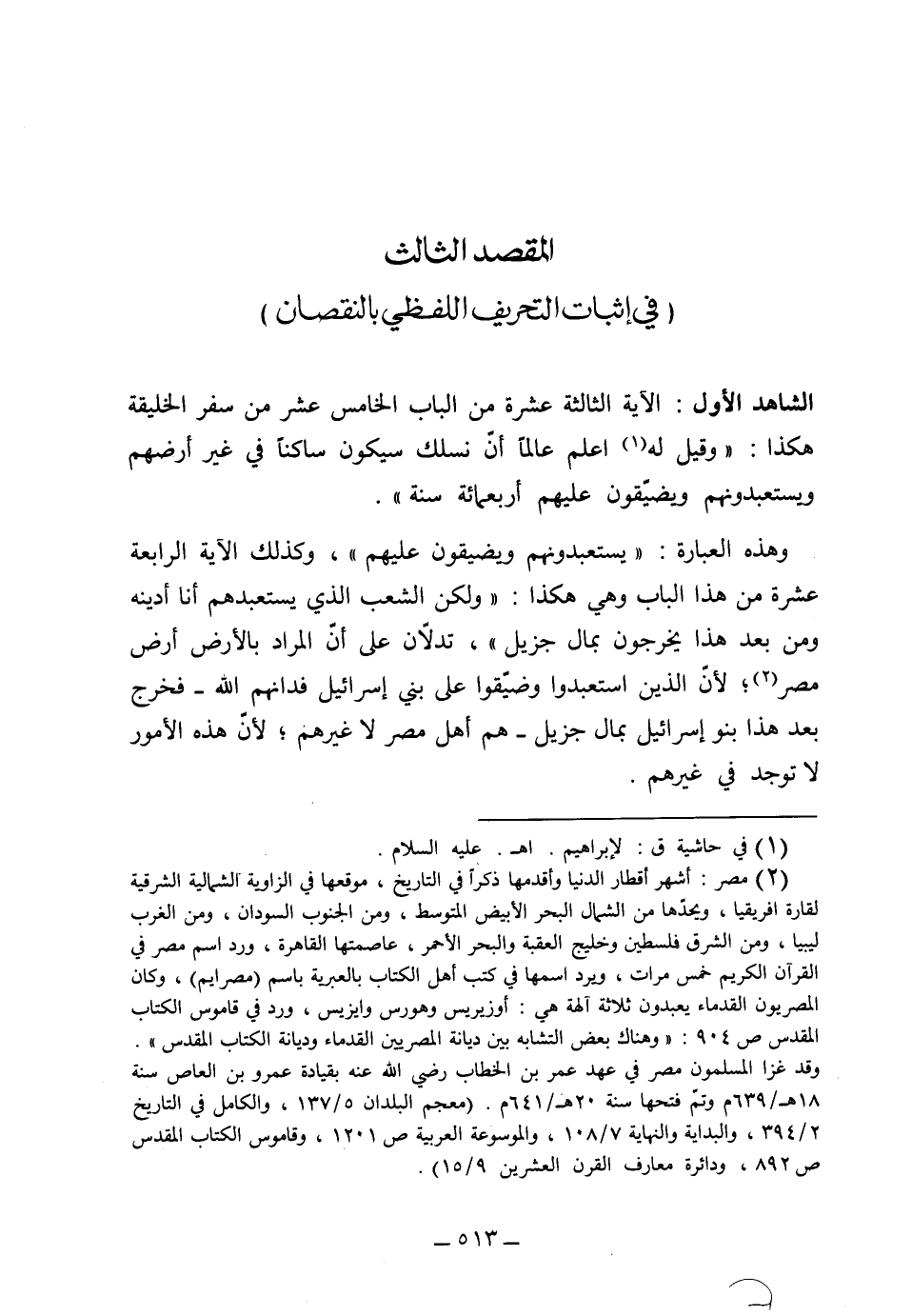 (الشاهد الأول) الآية الثانية عشرة من الباب الخامس عشر من سفر الخليقة هكذا: "وقيل له اعلم عالماً أن نَسْلك سيكون ساكناً في غير أرضهم ويستعبدونهم ويضيقون عليهم أربعمائة سنة" وهذه العبارة "يستعبدونهم ويضيقون عليهم" وكذلك الآية الرابعة عشرة من هذا الباب وهي هكذا: "ولكن الشعب الذي يستعبدهم أنا أدينه، ومن بعد هذا يخرجون بمال" تدلان على أن المراد بالأرض أرض مصر، لأن الذين استعبدوا وضيقوا على بني إسرائيل فدانهم الله فخرج بعد هذا بنو إسرائيل بمال جزيل هم أهل مصر لا غيرهم، لأن هذه الأمور لا توجد في غيرهم،.