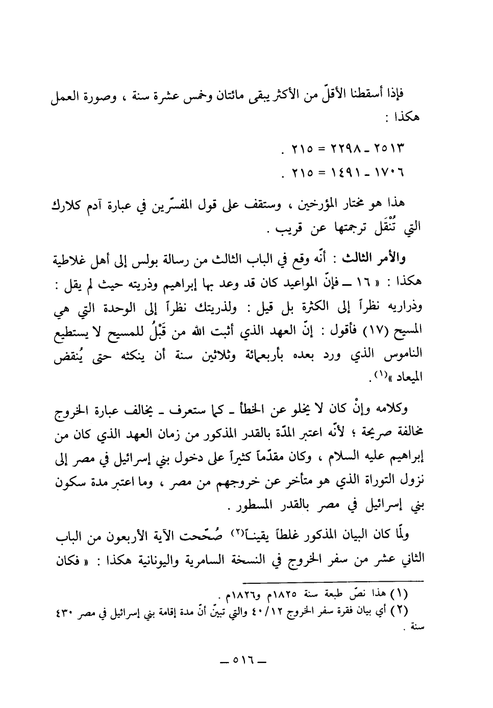 الثالث: أنه وقع في الباب الثالث من رسالة بولس إلى أهل غلاطيه هكذا 66: "فإن المواعيد كان قد وعد بها إبراهيم وذريته، حيث لم يقل وذراريه نظراً إلى الكثرة بل قيل ولذريتك نظراً إلى الوحدة التي هي المسيح" 17 "فأقول إن العهد الذي أثبت الله من قَبْلُ للمسيح لا يستطيع الناموس الذي ورد بعده بأربعمائة وثلاثين سنة أن ينكثه حتى ينقضي الميعاد". وكلامه وإن كان لا يخلو عن الخطأ كما ستعرف يخالف عبارة الخروج مخالفة صريحة، لأنه اعتبر المدة بالقدر المذكور من زمان العهد الذي كان من إبراهيم عليه السلام، وكان مقدماً كثيراً على دخول بني إسرائيل في مصر إلى نزول التوراة الذي هو متأخر عن خروجهم عن مصر، وما اعتبر مدة سكن بني إسرائيل في مصر بالقدر المسطور. ولما كان البيان المذكور غلطاً يقيناً صححت الآية الأربعون من الباب الثاني عشر من سفر الخروج في النسخة السامرية واليونانية هكذا: "فكان