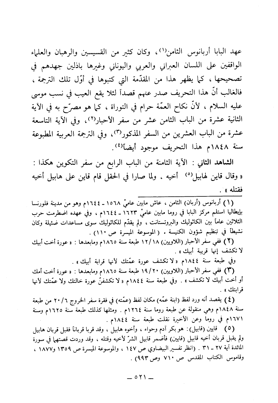 (الشاهد الثاني) الآية الثامنة من الباب الرابع من سفر التكوين هكذا: "وقال قابيل لهابيل أخيه ولما صارا في الحقل قام قابيل على هابيل أخيه