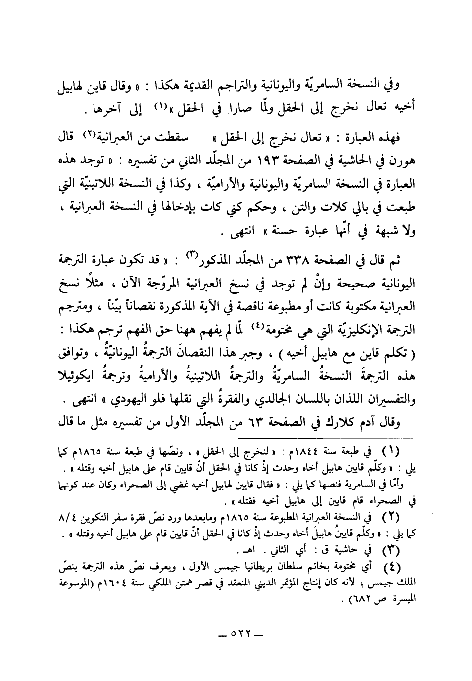 فقتله" وفي النسخة السامرية واليونانية والتراجم القديمة هكذا: "وقال قابيل لهابيل أخيه تعال نخرج إلى الحقل ولما صارا في الحقل" إلى آخرها فهذه العبارة "تعال نخرج إلى الحقل" سقطت من العبرانية. قال هورن في الحاشية في الصفحة 193 من المجلد الثاني من تفسيره: "توجد هذه العبارة في النسخة السامرية واليونانية والآرامية، وكذا في النسخة اللاطينينة التي طبعت في بالي كلات والتن وحكم كني كات بإدخالها في النسخة العبرانية ولا شبهة في أنها عبارة حسنة" انتهى ثم قال في الصفحة 338 من المجلد المذكور: "قد تكون عبارة الترجمة اليونانية صحيحة لم توجد في نسخ العبرانية المروّجة الآن، مثلاً نسخ العبرانية مكتوبة كانت أو مطبوعة ناقصة في الآية المذكورة نقصاناً بيِّناً، ومترجم الترجمة الإنكليزية التي هي مختومة لما يفهم ههنا حق الفهم ترجم هكذا" "تكلم قابيل مع هابيل أخيه" وجبر هذا النقصان في الترجمة اليونانية، وتوافق هذه الترجمة النسخة السامرية والترجمة اللاطينية والآرامية وترجمة ايكوئيلا والتفسيران اللذان باللسان الجالدي والفقرة التي نقلها فلو اليهودي" وقال آدم كلارك في الصفحة 63 من المجلد الأول من تفسيره مثل ما قال