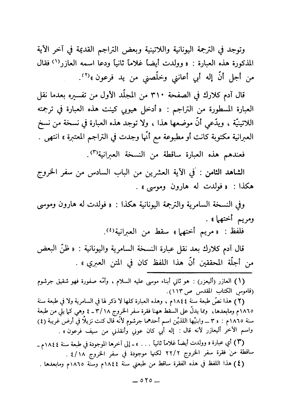 (الشاهد الثامن) في الآية العشرين من الباب السادس من سفر الخروج هكذا: "فولدت له هرون وموسى" وفي النسخة السامرية والترجمة اليونانية وهكذا: "فولدت له هارون وموسى ومريم أختهما" فلفظ "مريم أختهما" سقط من العبرانية، قال آدم كلارك بعد نقل عبارة النسخة السامرية واليونانية: "ظن البعض من أَجِلّة المحققين أن هذا اللفظ كان في المتن العبري".