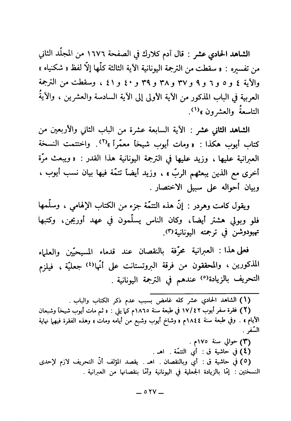 (الشاهد الثاني عشر) الآية السابعة عشرة من الباب الثاني والأربعين من كتاب أيوب هكذا: "ومات أيوب شيخاً معمراً" واختتمت النسخة العبرانية عليها، وزيد عليها في الترجمة اليونانية هذا القدر "ويبعث مرة أخرى مع الذين يبعثهم الرب" وزيد أيضاً تتمة فيها بيان نسب أيوب، وبيان أحواله على سبيل الاختصار، ويقول كامت وهِرْدَر: إن هذه التتمة جزء من الكتاب الإلهامي، وسلمها فلوو بولي هستر أيضاً وكان الناس يسلمون في عهد أرجن، وكتبها تهيودوشن في ترجمته اليونانية، فعلى هذا العبرانية محرفة بالنقصان عند القدماء المسيحيين، والعلماء المذكورين، والمحققون من فرقة البروتستنت على أنها جعلية، فيلزم التحريف بالزيادة عندهم في الترجمة اليونانية،