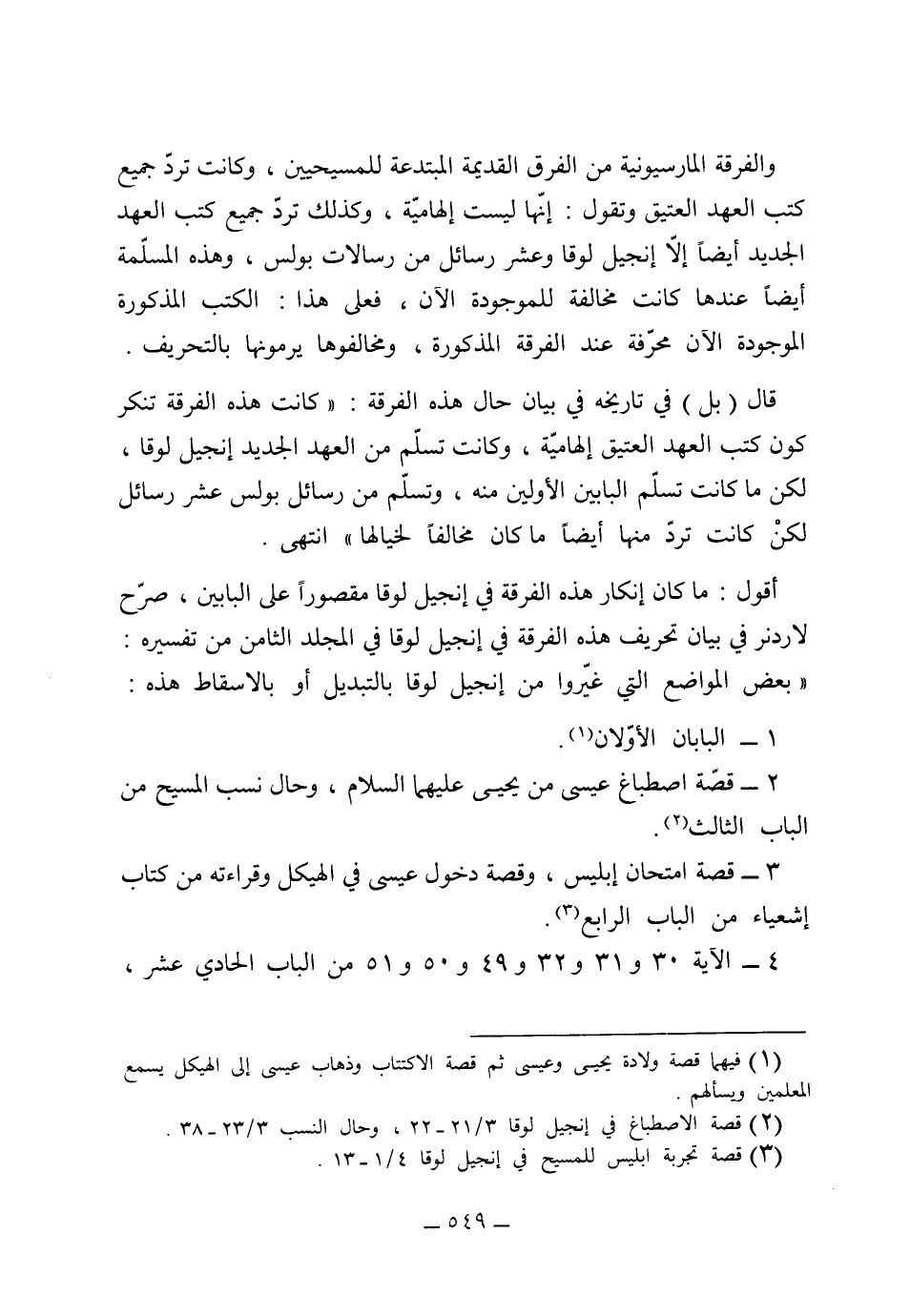 والفرقة المارسيونية من الفرق القديمة المبتدعة للمسيحيين كانت ترد جميع كتب العهد العتيق، وتقول إنهاليست إلهامية، وكذا ترد جميع كتب العهد الجديد أيضاً إلا إنجيل لوقا وعشر رسائل من رسالات بولس، وهذه المسلمة أيضاً عندها كانت مخالفة للموجودة الآن فعلى هذا الكتب المذكورة الموجودة الآن محرّفة عند الفرقة المذكورة ومخالفوها يرمونها بالتحريف، (قال بل) في تاريخه في بيان حال هذه الفرقة: "كانت هذه الفرقة تنكر كون كتب العهد العتيق إلهامية وكانت تسلم من العهد الجديد إنجيل لوقا، لكن ما كانت تسلم البابين الأولين منه وتسلم من رسائل بولس عشر رسائل، لكن كانت ترد منها أيضاً ما كان مخالفاً لخيالها" أقول: ما كان إنكار هذه الفرقة في إنجيل لوقا مقصوراً على البابين، صرح لاردنر في بيان تحريف هذه الفرقة في إنجيل لوقا في المجلد الثامن من تفسيره: "بعض المواضع التي غيروا من إنجيل لوقا بالتبديل أو بالإسقاط هذه: البابان الأولان قصة اصطباغ عيسى من يحيى عليهما السلام، وحال