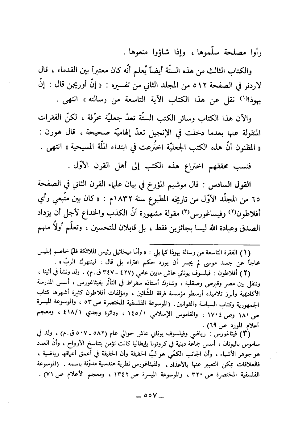 (القول السادس) قال موشيم المؤرخ في بيان علماء القرن الثاني في الصفحة 65 من المجلد الأول من تاريخه المطبوع سنة 1832: "كان بين متبعي رأي أفلاطون وفيساغورس مقولة مشهورة أن الكذب والخداع لأجل أن يزداد الصدق وعبادة الله ليسا بجائزين بل قابلان للتحسين، وتعلم أولاً منهم