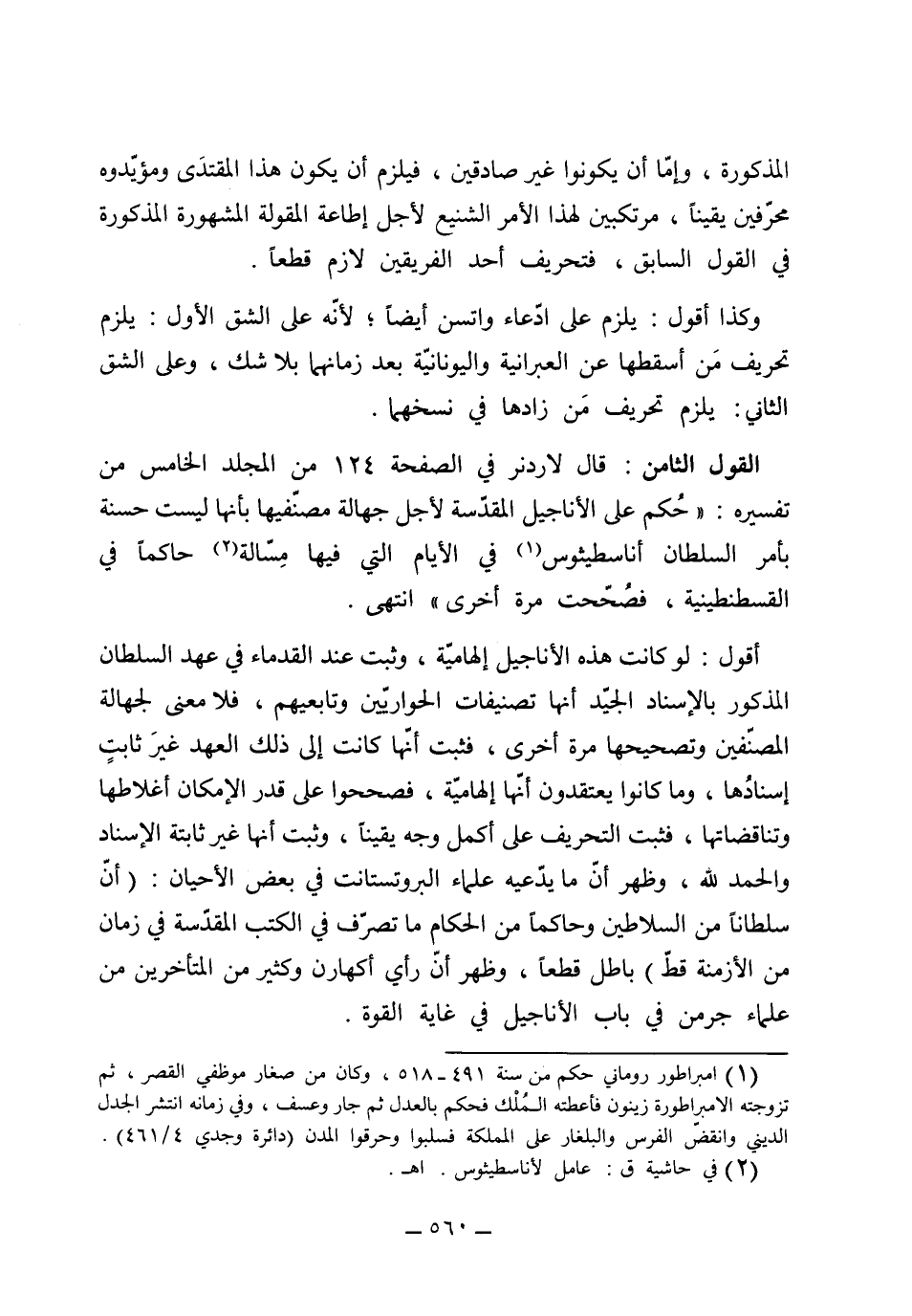 (القول الثامن) قال لاردنر في الصفحة 124 من المجلد الخامس من تفسيره: "حكم على الأناجيل المقدسة لأجل جهالة مصنفيها بأنها ليست حسنة بأمر السلطان اناسطيثوس في الأيام التي كان فيها مِسَّالة حاكماً في القسطنطينية فصُحِّحت مرة أخرى" أقول: لو كانت هذه الأناجيل إلهامية وثبت عند القدماء في عهد السلطان المذكور بالإسناد الجيد أنها تصنيفات الحواريين وتابعيهم فلا معنى لجهالة المصنفين وتصحيحها مرة أخرى، فثبت أنها كانت إلى ذلك العهد غير ثابت إسنادها، وكانوا يعتقدون أنها إلهامية فصححوا على قدر الإمكان أغلاطها وتناقضاتها، فثبت التحريف على أكمل وجه يقيناً، وثبت أنها غير ثابتة الإسناد والحمد لله، وظهر أن ما يدعيه علماء البروتستنت في بعض الأحيان أن سلطاناً من السلاطين وحاكماً من الحكام ما تصرف في الكتب المقدسة في زمانٍ من الأزمنة قط باطلٌ قطعاً، وظهر أن رأى إكهارن وكثير من المتأخرين من علماء الجرمن في باب الأناجيل في غاية القوة.