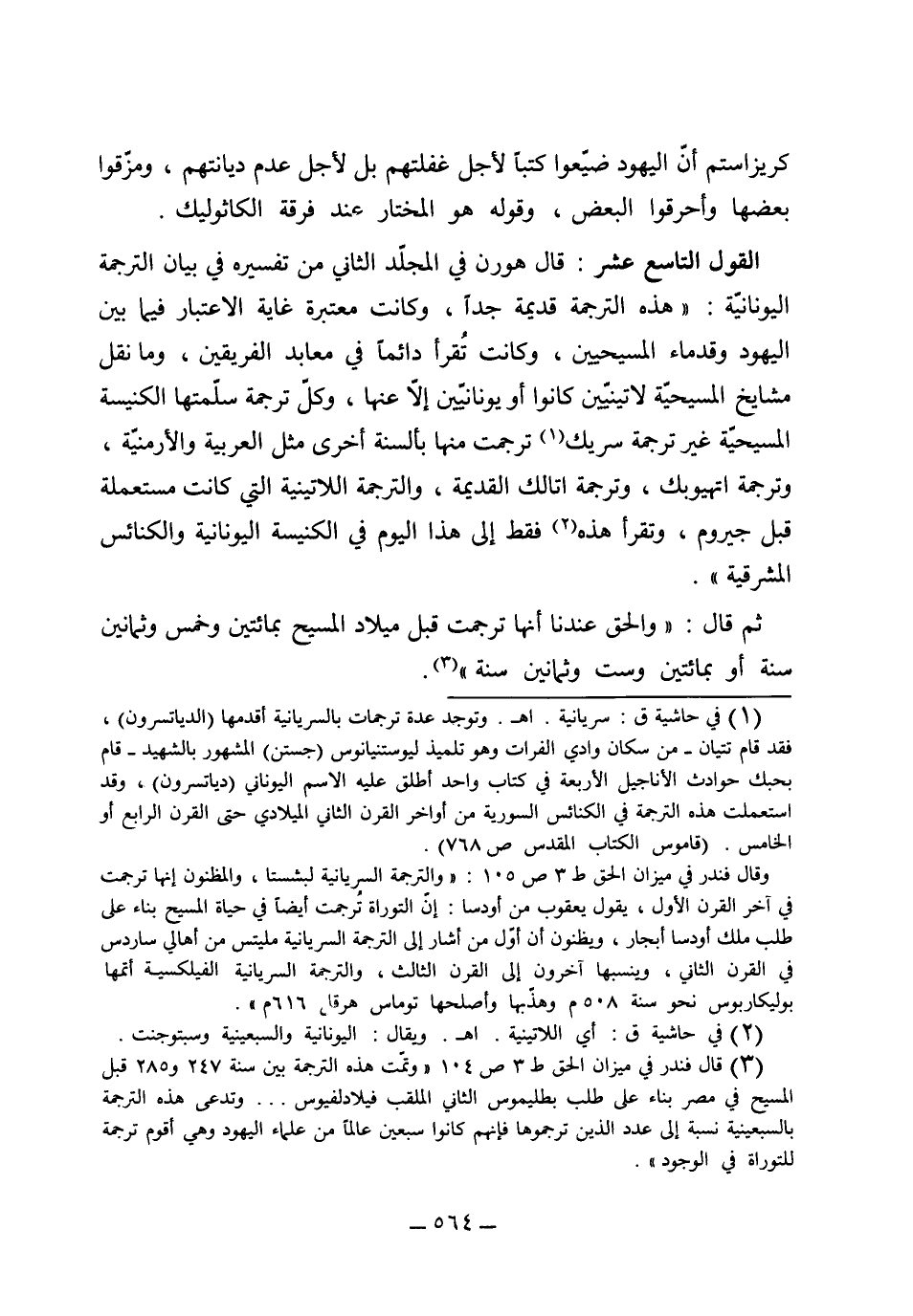 (القول التاسع عشر) قال هورن في المجلد الثاني من تفسيره في بيان الترجمة اليونانية: "هذه الترجمة قديمة جداً وكانت معتبرة غاية الاعتبار فيما بين اليهود والقدماء المسيحيين، وكانت تقرأ دائماً في معابد الفريقين، وما نقل المشايخ المسيحية لاطينيين كانوا أو يونانيين إلاّ عنها وكلُّ ترجمة سلمها الكنيسة المسيحية غير ترجمة سِريك ترجمتْ منها في ألسنة أخرى مثل العربية والأرمنية، وترجمة إتهيوبك وترجمة أتالك القديمة والترجمة اللاطينية التي كانت مستعملة قبل جيروم، وتقرأ هذه فقط إلى هذا اليوم في الكنيسة اليونانية والكنائس الشرقية" ثم قال: "والحق عندنا أنها تُرجمت قبل ميلاد المسيح بمائتين وخمس وثمانين سنة أو بمائتين وست وثمانين سنة".