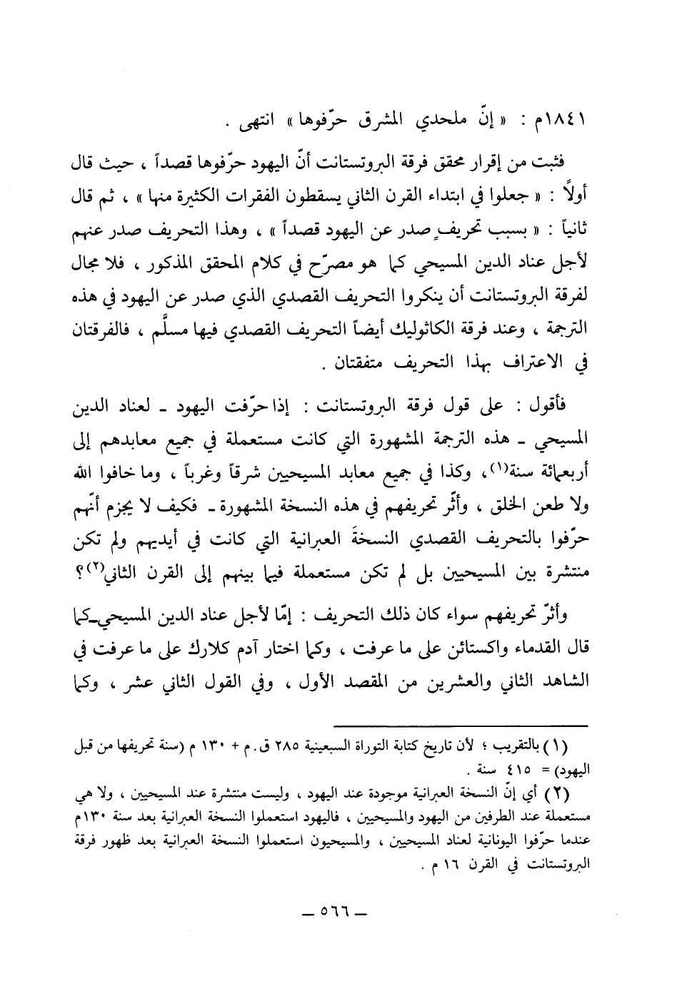 1841 "أن مُلحدي المشرق حرفوها" فثبت من إقرار محقق فرقة البروتستنت أن اليهود حرفوها قصداً حيث قال أولاً: "جعلوا في ابتداء القرن الثاني يسقطون الفقرات الكثيرة منها" ثم قال ثانياً: "بسبب تحريف صَدَر عن اليهود قصداً" وهذا التحريف صدر عنهم لأجل عناد الدين المسيحي كما هو مصرحفي كلام المحقق المذكور، فلا مجال لفرقة البروتستنت أن ينكروا التحريف القصدي الذي صدر عن اليهود في هذه الترجمة وعند فرقة الكاثلك أيضاً التحريف القصدي فيها مسلم.