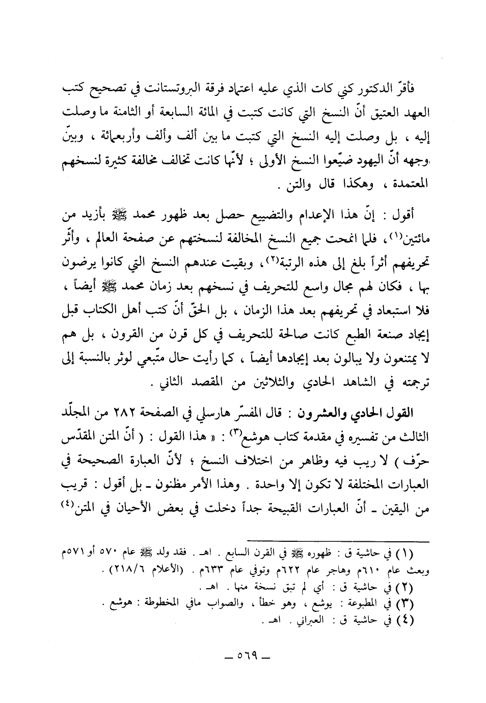 (القول الحادي والعشرون) قال المفسر هارسلي في الصفحة 282 من المجلد الثالث من تفسيره في مقدمة كتاب يوشع: "هذا القول أن المتن المقدس حرِّف لا ريب فيه، وظاهر من اختلاف النسخ لأن العبارة الصحيحة في العبارات المختلفة لا تكون إلا واحدة، وهذا الأمر مظنون، بل أقول قريب من اليقين أن العبارات القبيحة جداً دخلت في بعض الأحيان في المتن