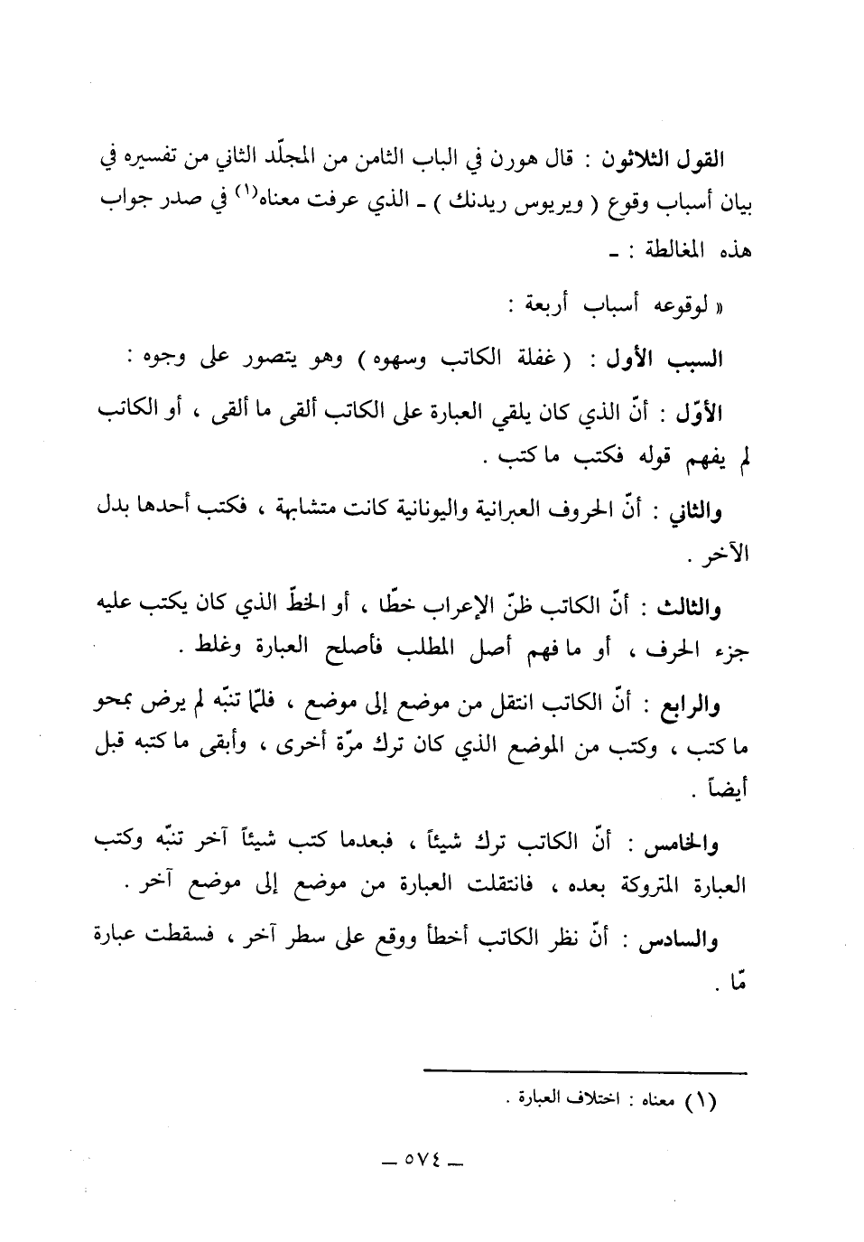 (القول الثلاثون) قال هورن في الباب الثامن من المجلد الثاني من تفسيره في بيان أسباب وقوع ويريوس ريدنك الذي عرفت معناه في صدر جواب هذه المغالطة: "لوقوعه أسباب أربعة".