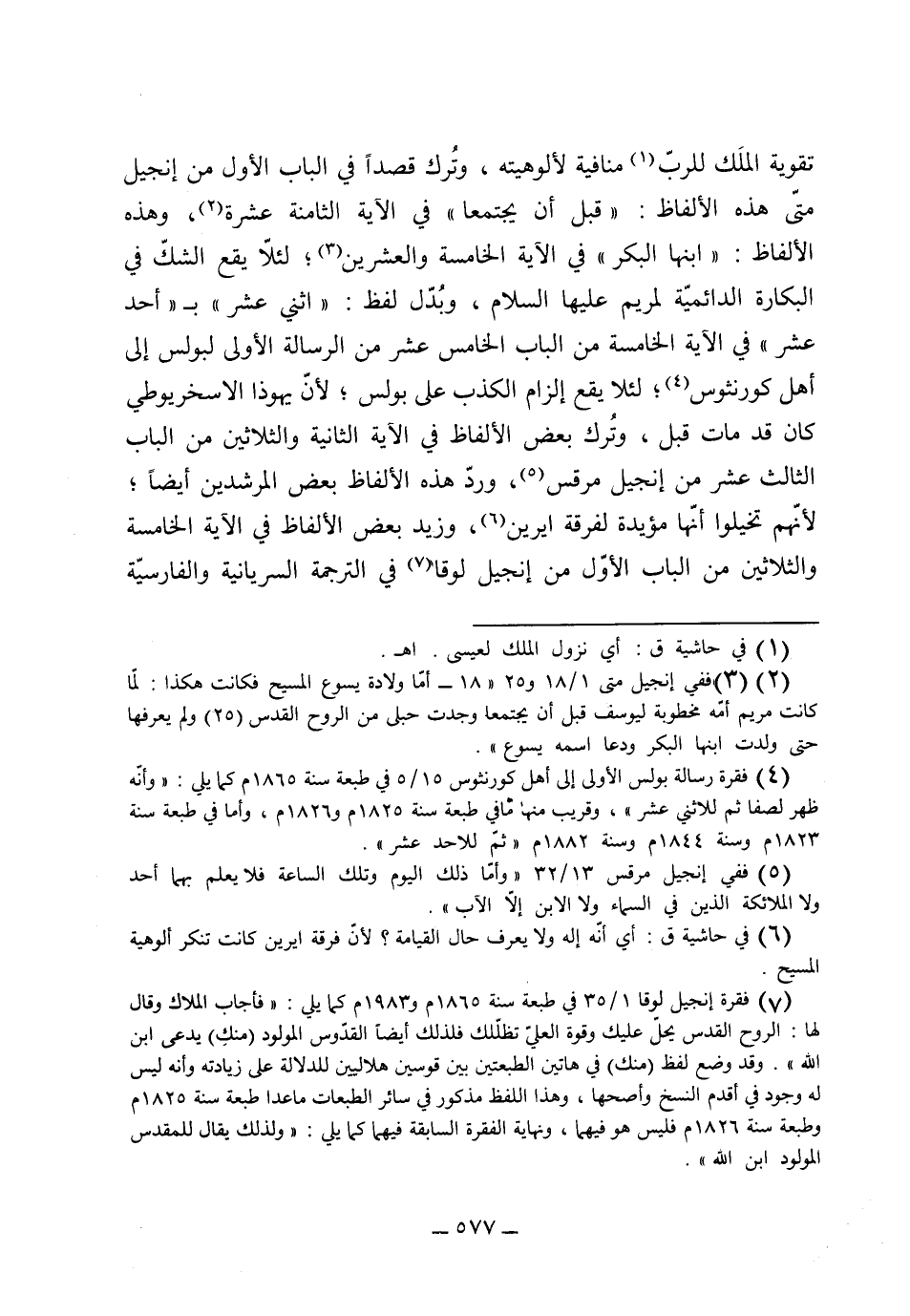 تقوية الملك للرب منافيةٌ لألوهيته، وتُرك قصداً في الباب الأول من إنجيل مَتّى هذه الألفاظ قبل أن يجتمعا في الآية الثامنة عشرة، وهذه الألفاظ (ابنها البكر) في الآية الخامسة والعشرين، لئلا يقع الشك في البكارة الدائمية لمريم عليها السلام، وبدل لفظ اثني عشر بأحد عشر في الآية الخامسة من الباب الخامس عشر من الرسالة الأولى لبولس إلى أهل قورنيثوس، لئلا يقع إلزام الكذب على بولس، لأن يهودا الأسخريوطي كان قد مات قبل، وتُرك بعض الألفاظ في الآية الثانية والثلاثين من الباب الثالث عشر من إنجيل مرقس، ورد هذه الألفاظ بعضُ المرشدين أيضاً لأنهم تخيلوا أنها مؤيِّدة لفرقة أيرين، وزيد بعض الألفاظ في الآية الخامسة والثلاثين من الباب الأول من إنجيل لوقا في الترجمة السريانية والفارسية