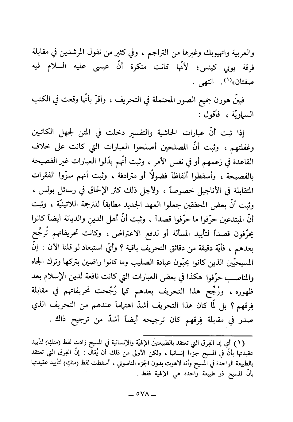 والعربية واتهيوبك وغيرها من التراجم، وفي كثير من نقول المرشدين في مقابلة فرقة لوتي كينس لأنها كانت منكرة أن عيسى عليه السلام فيه صفتان" فبين هورن جميع الصور المحتملة في التحريف وأقرَّ بأنها وقعت في الكتب السماوية، فأقول: إذا ثبت أن عبارات الحاشية والتفسير دخلت في المتن لجهل الكاتبين وغفلتهم، وثبت أن المصلحين أصلحوا العبارات التي كانت على خلاف القاعدة في زعمهم، أو في نفس الأمر، وثبت أنهم بدَّلوا العبارات الغير الفصيحة بالفصيحة وأسقطوا ألفاظاً فضولاً أو مترادفة، وثبت أنهم سَوَّوْا الفقرات المتقابلة في الأناجيل خصوصاً ولأجل ذلك كثر الإلحاق في رسائل بولس،