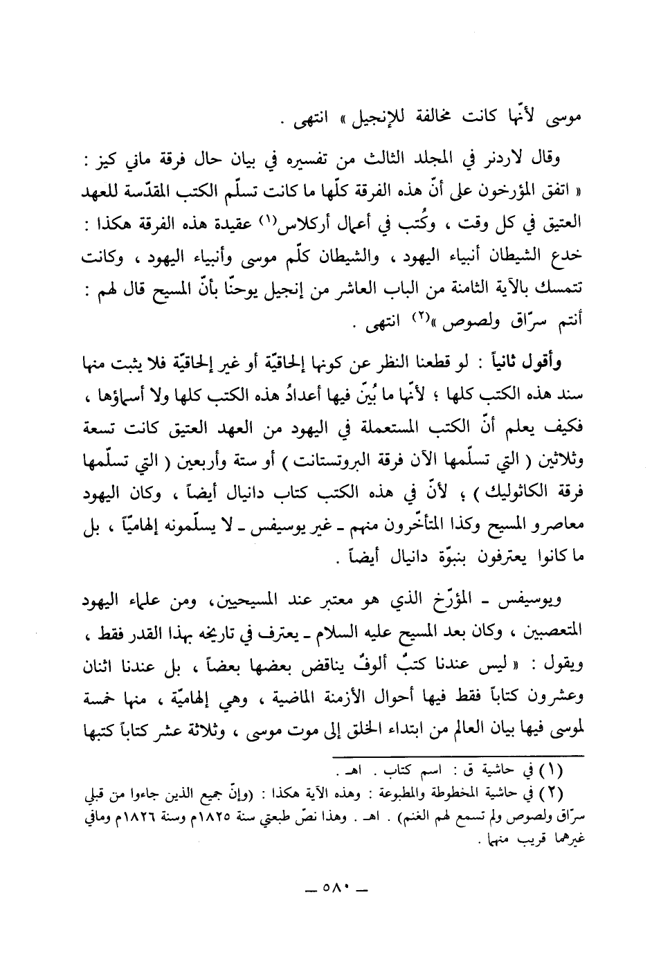 موسى لأنها كانت مخالفة للإنجيل"، وقال لاردنر في المجلد الثالث من تفسيره في بيان حال فرقة ماني كيز: "اتفق المؤرخون على أن هذه الفرقة كلها ما كانت تسلم الكتب المقدسة للعهد العتيق في كل وقت، وكتب في أعمال أركلاس عقيدة هذه الفرقة هكذا: خدع الشيطان أنبياء اليهود والشيطان كلَّم موسى وأنبياء اليهود وكانت تتمسك بالآية الثامنة من الباب العاشر من إنجيل يوحنا بأن المسيح قال لهم إنهم سراق ولصوص" وأقول ثانياً: لو قطعنا النظر عن كونها إلحاقية أو غير إلحاقية، فلا يثبت منها سند هذه الكتب كلها لأنها ما بُيّن فيها أعداد هذه الكتب كلها ولا أسماؤها فكيف يعلم أن الكتب المستعملة في اليهود من العهد العتيق كانت تسعة وثلاثين التي يسلمها الآن فرقة البروتستنت، أو ستة وأربعين التي يسلمها فرقة الكاثلك لأن في هذه الكتب كتاب دانيال أيضاً وكان اليهود معاصر والمسيح وكذا المتأخرون منهم غير يوسيفس لا يسلمونه إلهامياً، بل ما كانوا يعترفون بنبوة دانيال أيضاً، ويوسيفس المؤرخ الذي هو معتبر عند المسيحيين ومن علماء اليهود المتعصبين، وكان بعد المسيح عليه السلام، يعترف في تاريخه بهذا القدر فقط يقول: "ليس عندنا كتب ألوف يناقض بعضها بعضاً بل عندنا اثنان وعشرون كتاباً فقط فيها أحوال الأزمنة الماضية، وهي إلهامية منها خمسة لموسى فيها بيان العالم من ابتداء الخلق إلى موت موسى، وثلاثة كتاب كتبها