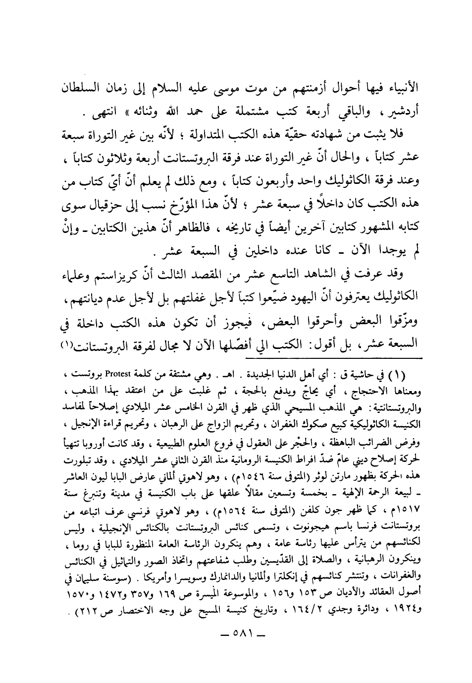 عشر كتاباً، وعند فرقة الكاثلك واحد وأربعون كتاباً، ومع ذلك لم يعلم أن أي كتاب من هذه الكتب كان داخلاً في سبعة عشر، لأن هذا المؤرخ نسب إلى حزقيال سوى كتابه المشهور كتابين آخرين أيضاً في تاريخه، فالظاهر أن هذين الكتابين وإن لم يوجدا الآن كانا عنده داخلين في سبعة عشر، وقد عرفت في الشاهد التاسع عشر من المقصد الثالث أن كريزاستم وعلماء الكاثلك يعترفون أن اليهود ضيّعوا كتباً لأجل غفلتهم، بل لأجل عدم ديانتهم، ومزقوا البعض وأحرقوا البعض، فيجوز أن تكون هذه الكتب داخلة في سبعة عشر بل أقول الكتب التي أفصِّلها الآن لا مجال لفرقة البروتستنت،