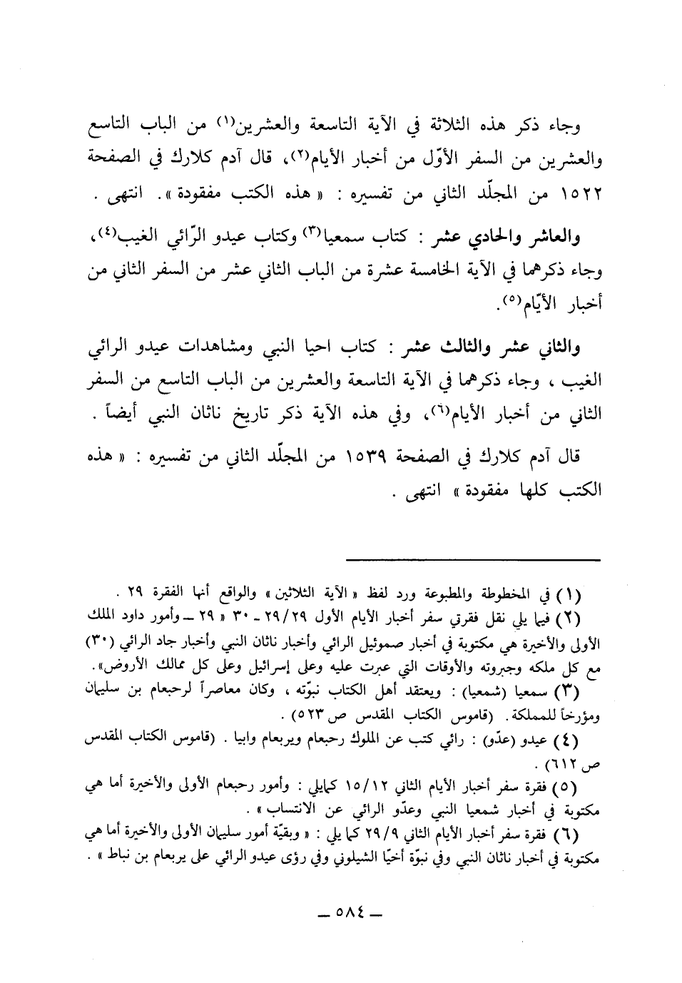 (العاشر) كتاب سمعيا، و (الحادي عشر) كتاب عيد والرائي الغيب، وجاء ذكرهما في الآية الخامسة عشرة من الباب الثاني عشر من السفر الثاني من أخبار الأيام، و (الثاني عشر) كتاب أحيا النبي، و (الثالث عشر) مشاهدات عيد والرائي الغيب، وجاء ذكرهما في الآية التاسعة والعشرين من الباب التاسع من السفر الثاني من أخبار الأيام، وفي هذه الآية ذكر تاريخ ناثان النبي أيضاً، قال آدم كلارك في الصفحة 1539 من المجلد الثاني من تفسيره: "هذه الكتب كلها مفقودة"،.