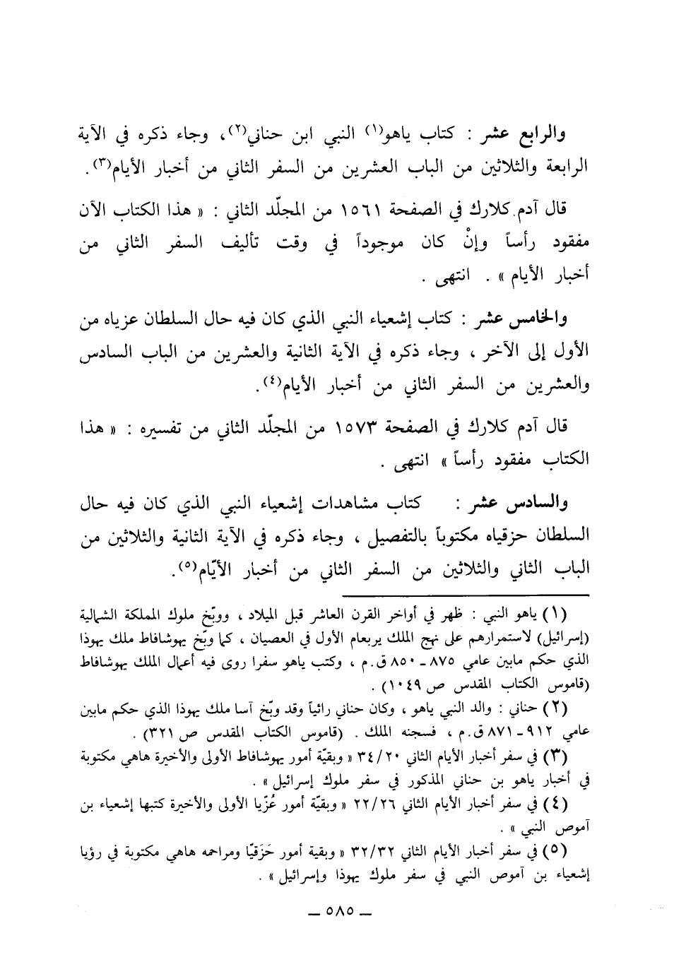 و (الرابع عشر) كتاب يا هو النبي ابن حناتي وجاء ذكره في الآية الرابعة والثلاثين من الباب العشرين من السفر الثاني من أخبار الأيام، قال آدم كلارك في الصفحة 1562 من المجلد الثاني: "هذا الكتاب الآن مفقود رأساً، وإن كان موجوداً في وقت تأليف السفر الثاني من أخبار الأيام" (الخامس عشر) كتاب أشعياء النبي الذي كان فيه حال السلطان عزياه من الأول إلى الآخر، وجاء ذكره في الآية الثانية والعشرين من الباب السادس والعشرين من السفر الثاني من أخبار الأيام، قال آدم كلارك في الصفحة 1573 من المجلد الثاني من تفسيره: "هذا الكتاب مفقود رأساً" (السادس عشر) كتاب مشاهدات أشعياء النبي الذي كان فيه حال السلطان حزقياه مكتوباً بالتفصيل، وجاء ذكره في الآية الثانية والثلاثين من السفر الثاني من أخبار الأيام،.