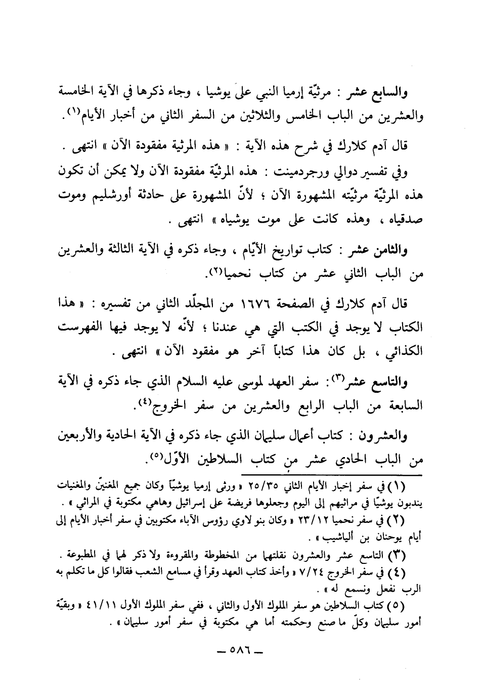 تواريخ الأيام، وجاء ذكره في الآية الثالثة من الباب الثاني عشر من كتاب نحميا قال آدم كلارك في الصفحة 1676 من المجلد الثاني من تفسيره: "هذا الكتاب لا يوجد في الكتب التي هي عندنا لأنه لا يوجد فيها الفهرست الكذائي بل كان هذا كتاباً آخر هو مفقود الآن"، و (التاسع عشر) سفر العهد لموسى الذي جاء ذكره في الآية السابعة من الباب الرابع والعشرين من سفر الخروج، (والعشرون) كتاب أعمال سليمان الذي جاء ذكره في الآية الحادية والأربعين من الباب الحادي عشر من كتاب سلاطين الأول،