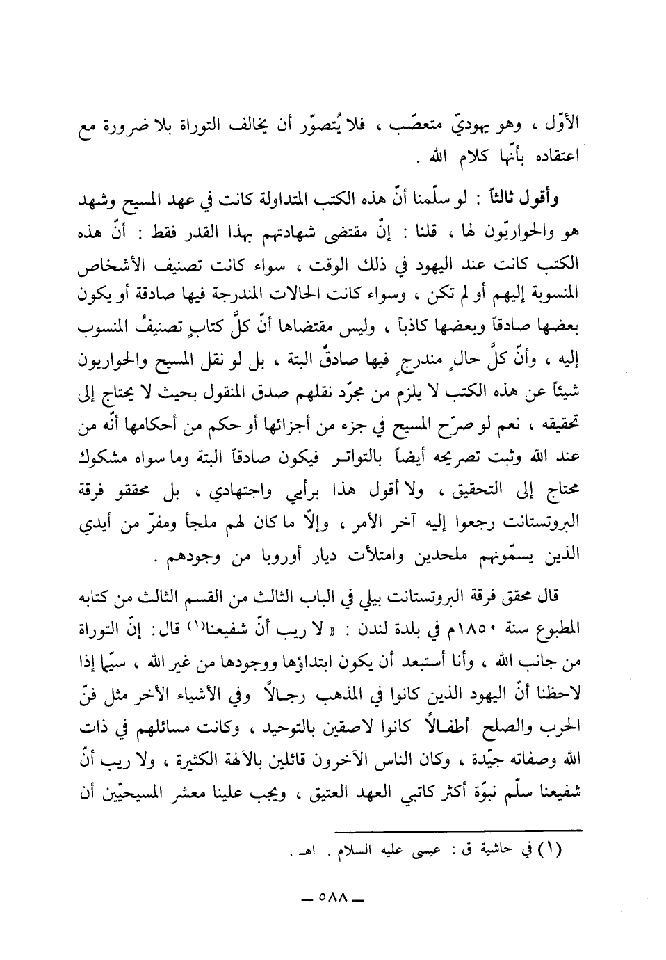 الأول، وهو يهودي متعصب، فلا يتصوّر أن يخالف التوراة بلا ضرورة مع اعتقاده بأنه كلام الله، وأقول ثالثاً لو سلمنا أن هذه الكتب المتداولة كانت في عهد المسيح، وشهد هو والحواريون لها قلنا: إن مقتضى شهادتهم هذا القدر فقط أن هذه الكتب كانت عند اليهود في ذلك الوقت سواء كانت تصنيف الأشخاص المنسوبة إليهم أو لم تكن، وسواء كانت الحالات المندرجة فيها صادقة أو يكون بعضها صادقاً وبعضها كاذباً، وليس مقتضاها أن كل كتاب تصنيف المنسوب إليه، وأن كل حال مندرج فيها صادق البتة، بل لو نقل المسيح والحواريون شيئاً عن هذه الكتب لا يلزم عن مجرد نقلهم صدق المنقول، بحيث لا يحتاج إلى تحقيقه - نعم لو صرح المسيح في جزء من أجزائها أو حكم من أحكامها أنه من عند الله وثبت تصريحه أيضاً بالتواتر، فيكون صادقاً ألبتة، وما سواه مشكوك محتاج إلى التحقيق، ولا أقول هذا برأيي واجتهادي، بل محققو فرقة البروتستنت رجعوا إليه آخر الأمر وإلا ما كان لهم ملجأ أو مفر من أيدي الذين يسمونهم ملحدين، وامتلأت ديار أوربا من وجودهم، قال محقق فرقة البروتستنت بيلي في الباب الثالث من القسم الثالث من كتابه المطبوع سنة 1850 في بلدة لندن: "لا ريب أن شفيعنا قال إن التوراة من جانب الله وأنا أستبعد أن يكون ابتداؤه ووجوده من غير الله سيما إذا لاحظنا أن اليهود الذين كانوا في المذهب رجالاً وفي الأشياء الأخر