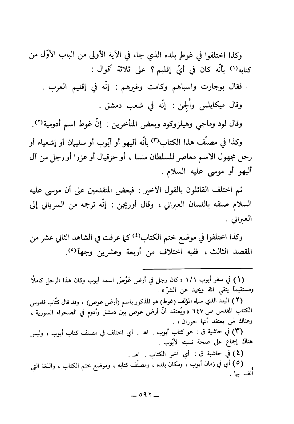وكذا اختلفوا في غوط بلده الذي جاء ذكره في الآية الأولى من الباب الأول من كتابه بأنه كان في أي إقليم، على ثلاثة أقوال: فقال بوجارت وأسباهم وكامت وغيرهم إنه في إقليم العرب، وقال ميكايلس وإلجن إنه في شِعْب دمشق، وقال لود وماجي وهيلز وكود وبعض المتأخرين إن غوط اسم أدومية وكذا في مصنف هذا الكتاب بأنه اليهود أو أيوب أو سليمان أو أشعياء أو رجل مجهول الاسم معاصر" للسلطان منسا أو حزقيال أو عزرا أو رجل من آل اليهود أو موسى عليه السلام، ثم اختلف القائلون بالقول الأخير فبعض المتقدمين على أن موسى عليه السلام صنفه في اللسان العبراني، وقال أرجن إنه ترجمه من السرياني إلى العبراني، وكذا اختلفوا في موضع ختم الكتاب كما عرفت في الشاهد الثاني عشر من المقصد الثالث، ففيه اختلاف من أربعة وعشرين وجهاً.