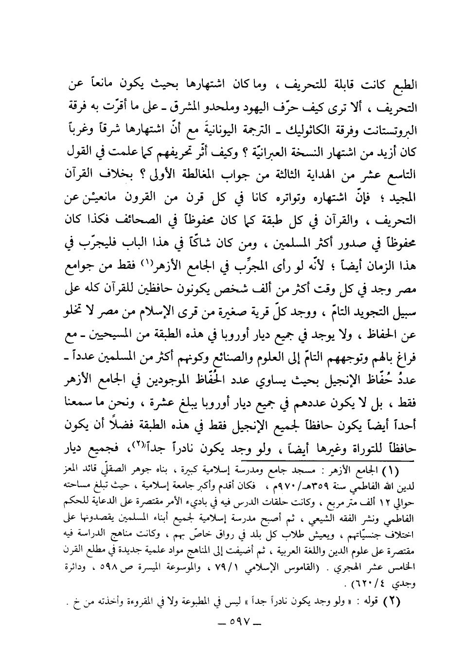 الطبع كانت قابلة للتحريف، وما كان اشتهارها بحيث يكون مانعاً عن التحريف، ألا ترى كيف حرف اليهود وملحدو المشرق على ما أقرت به فرقة البروتستنت وفرقة الكاثلك الترجمة اليونانية، مع أن اشتهارها شرقاً وغرباً كان أزيد من اشتهار النسخة العبرانية، وكيف أثر تحريفهم كما علمت في القول التاسع عشر من الهداية الثالثة من جواب المغالطة الأولى بخلاف القرآن المجيد فإن اشتهاره وتواتره كانا في كل قرن من القرون مانِعَيْن عن التحريف، والقرآن في كل طبقة كما كان محفوظاً في الصحائف فكذا كان محفوظاً في صدور أكثر المسلمين، ومن كان شاكاً في هذا الباب فليجرب في هذا الزمان أيضاً لأنه لو رأى المجرب في الجامع الأزهر فقط من جوامع مصر وجد في كل وقت أكثر من ألف شخص يكونون حافظين للقرآن كله على سبيل التجويد التام، ووجد كل قرية صغيرة من قرى الإسلام من مصر لا تخلو عن الحفاظ، ولا يوجد في جميع ديار أوربا في هذه الطبقة من المسيحيين مع فراغ بالهم وتوجههم التام إلى العلوم والصنائع وكونهم أكثر من المسلمين عدداً عدد حفاظ الإنجيل بحيث يساوي عدد الحفاظ الموجودين في الجامع الأزهر فقط، بل لا يكون عددهم في جميع ديار أوربا يبلغ عشرة، ونحن ما سمعنا أحداً أيضاً يكون حافظاً لجميع الإنجيل فقط في هذه الطبقة فضلاً أن يكون حافظاً للتوراة وغيره أيضاً، فجميع ديار أوربا