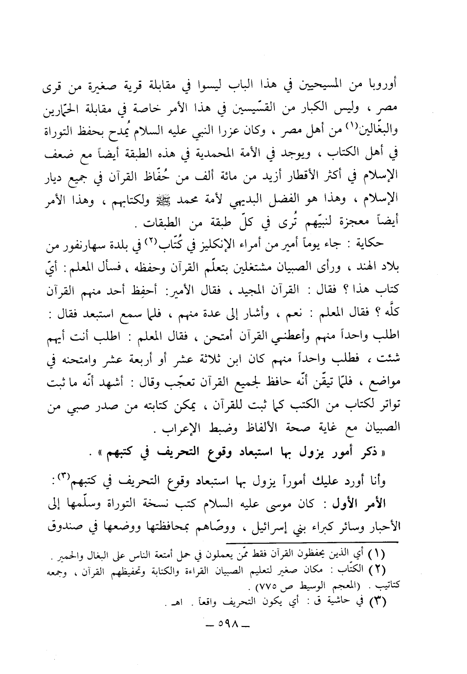 مصر، وليس الكبار من القسيسين في هذا الأمر خاصة في مقابلة الحمارين والبغالين من أهل مصر، وكان عُزَيْز النبي عليه السلام يُمْدَحُ بحفظ التوراة في أهل الكتاب، ويوجد في الأمة المحمدية في هذه الطبقة أيضاً مع ضعف الإسلام في أكثر الأقطار أزيد من مائة ألف من حفاظ القرآن في جميع ديار الإسلام، وهذا هو الفضل البديهي لأمة محمد صلى الله عليه وسلم ولكتابهم، وهذا الأمر أيضاً معجزة لنبيهم ترى في كل طبقة من الطبقات.