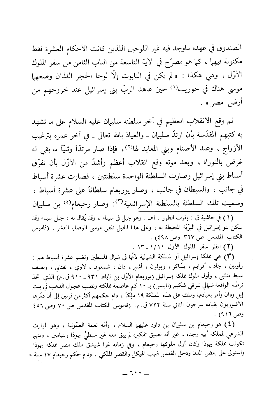 سليمان الصندوق في عهده ما وجد فيه غير اللَّوْحين اللذين كانت الأحكام العشرة فقط مكتوبة فيهما كما هو مصرح في الآية التاسعة من الباب الثامن من سفر الملوك الأول وهي هكذا: "ولم يكن في التابوت إلا اللوحان الحجريان اللذان وضعهما موسى بحوريت حيث عاهد الرب بني إسرائيل وأخرجهم من أرض مصر" ثم وقع الانقلاب العظيم في آخر سلطنة سليمان عليه السلام على ما تشهد به كتبهم المقدسة بأن ارتد سليمان والعياذ بالله تعالى في آخر عمره بترغيب الأزواج وعَبَد الأصنام وبنى المعابد لها، فإذا صار مرتد أو وثنياً ما بقي له غرض بالتوراة، وبعد موته وقع انقلاب أعظم وأشد من الأول بأن تفرق أسباط بني إسرائيل وصارت السلطنة الواحدة سلطنتين، فصارت عشرة أسباط في جانب والسبطان في جانب، وصار يوربعام سلطاناً على عشرة أسباط وسميت تلك السلطنة الإسرائيلية، وصار رحبعام بن سليمان