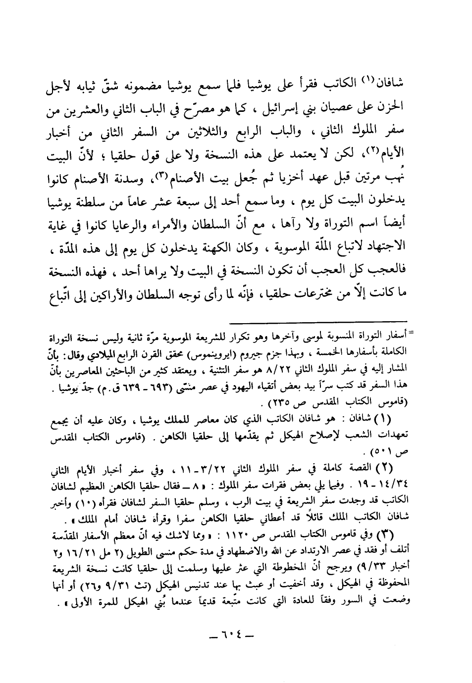 الملة الموسوية، وكانت الكهنة يدخلون كل يوم إلى هذه المدة، فالعجب كل العجب أن تكون النسخة في البيت ولا يراها أحد، فهذه النسخة ما كانت إلا من مخترعات حلقيا فإنه لما رأى توجه السلطان والأراكين إلى اتباع
