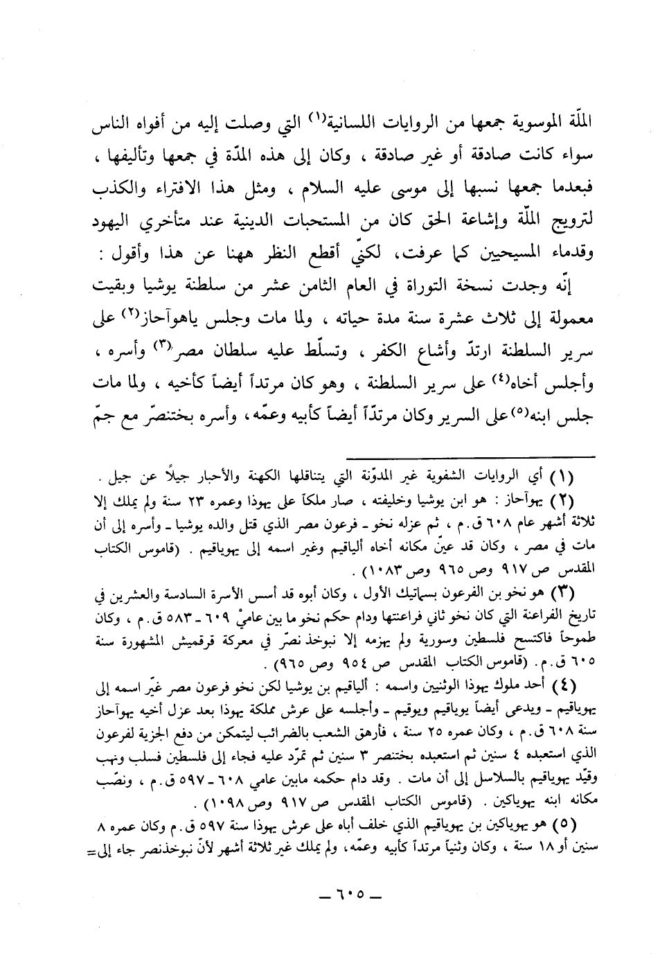 الملة الموسوية، جمعها من الروايات اللسانية التي وصلت إليه من أفواه الناس سواء كانت صادقة أو غير صادقة، وكان إلى هذه المدة في جمعها وتأليفها، فبعد ما جمع نسب إلى موسى عليه السلام، ومثل هذا الافتراء والكذب لترويج الملة وإشاعة الحق كان من المستحبات الدينية عند متأخري اليهود وقدماء المسيحيين كما عرفت، لكني أقطع النظر ههنا عن هذا وأقول إنه وجدت نسخة التوراة في العام الثامن عشر من سلطنة يوشيا وبقيت معمولة إلى ثلاث عشرة سنة مدة حياته، ولما مات وجلس ياهوحاز على سرير السلطنة ارتد وأشاع الكفر وتسلط عليه سلطان مصر وأسره وأجلس أخاه على سرير السلطنة، وهو كان مرتداً أيضاً كأخيه ولما مات جلس ابنه على السرير وكان مرتداً كأبيه وعمه، وأسره بختنصَّر مع جم