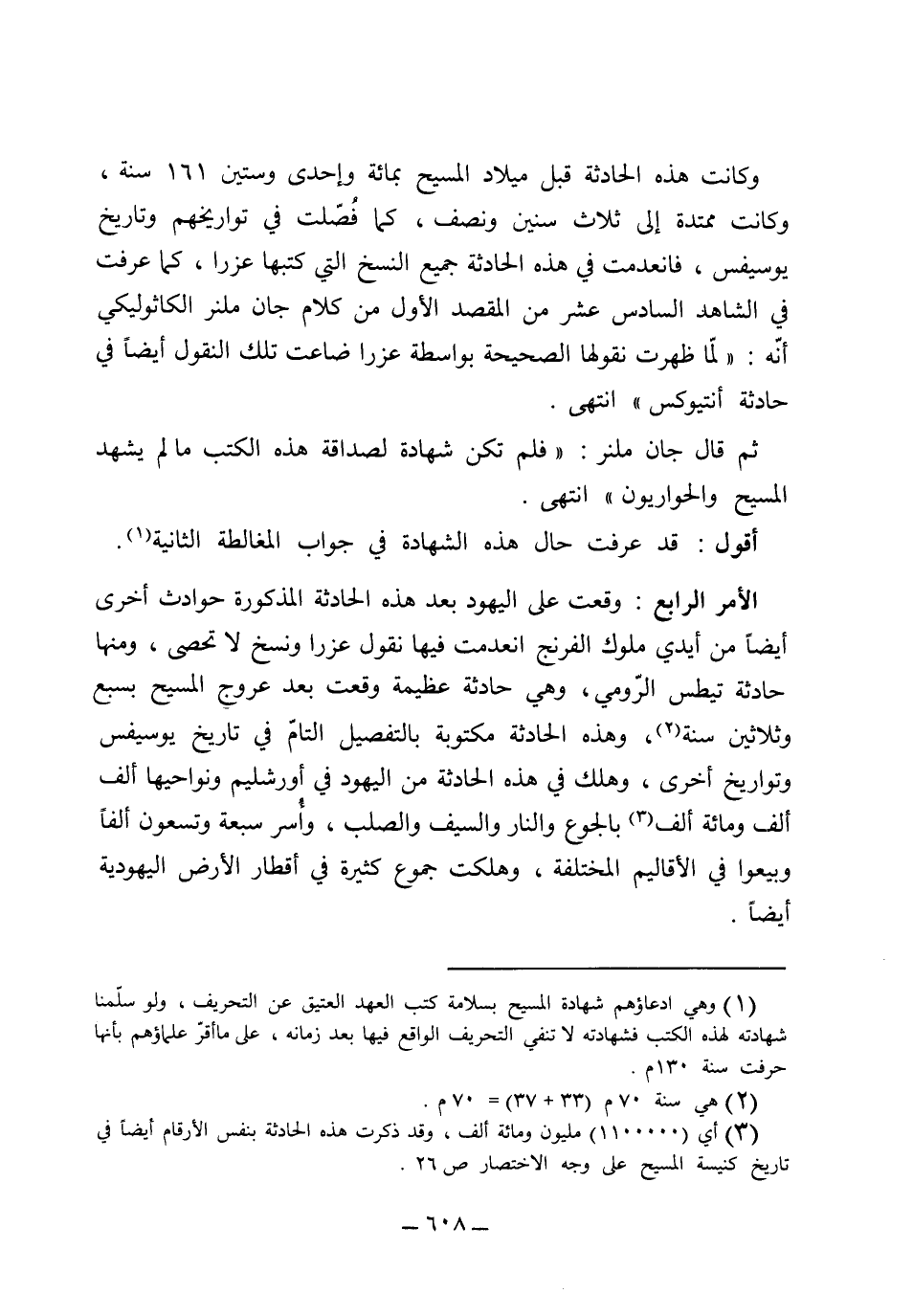 وكانت هذه الحادثة قبل ميلاد المسيح بمائة وإحدى وستين سنة، وكانت ممتدة إلى ثلاث سنين ونصف كما فصلت في تواريخهم وتاريخ يوسيفس، فانعدمت في هذه الحادثة جميع النسخ التي كتبها عزرا كما عرفت في الشاهد السادس عشر من المقصد الأول من كلام جان ملنر كاثلك "لما ظهرت نقولها الصحيحة بواسطة عزرا ضاعت تلك النقول أيضاً في حادثة أنتيوكس" انتهى ثم قال جان ملنر: "فلم تكن شهادة لصداقة هذه الكتب ما لم يشهد المسيح والحواريون" (أقول) قد عرفت حال هذه الشهادة في جواب المغالطة الثانية.
