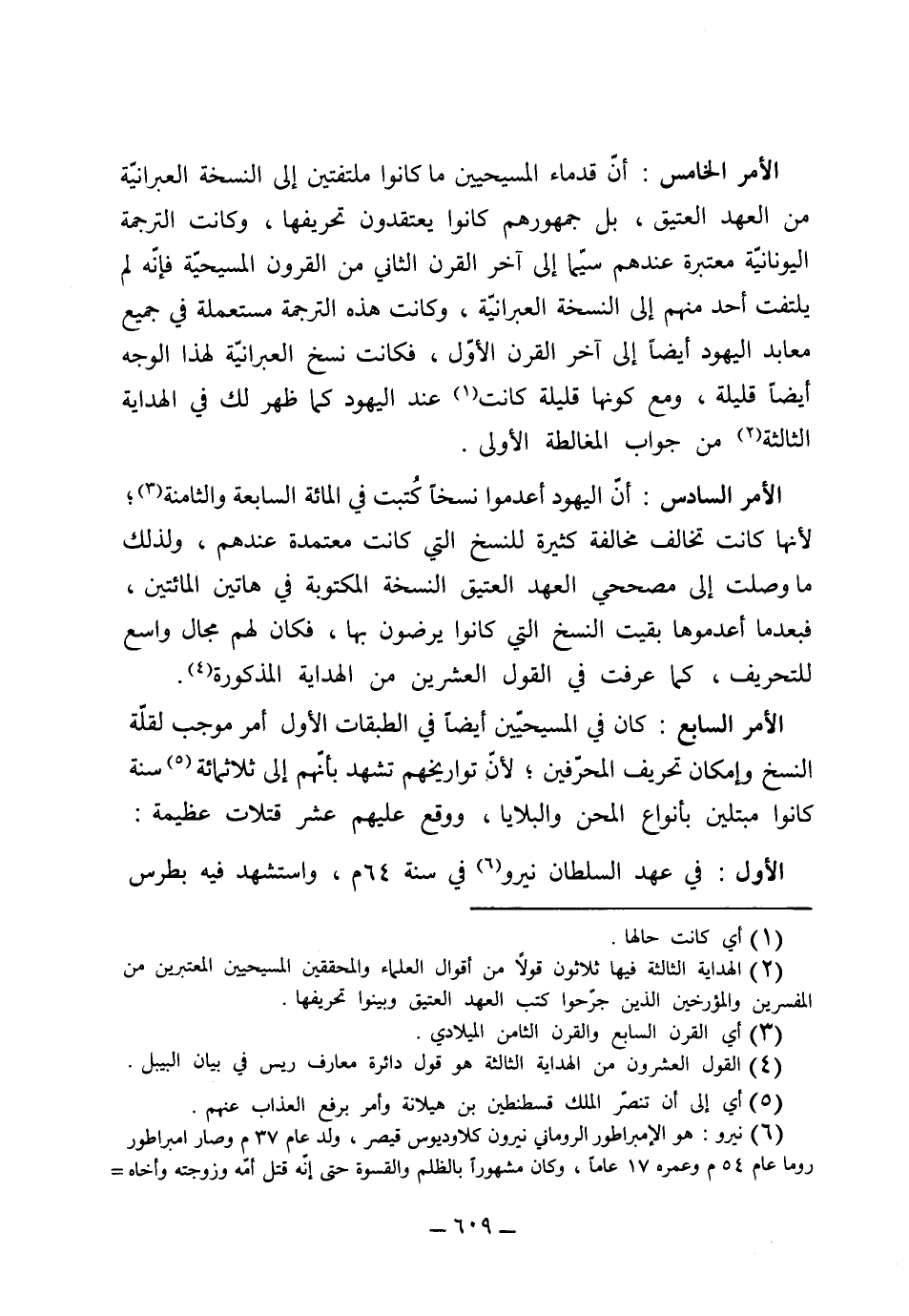 (الأمر السابع) كان في المسيحيين أيضاً في الطبقات الأول أمر موجب لقلة النسخ وإمكان تحريف المحرفين، لأن تواريخهم تشهد بأنهم إلى ثلثمائة سنة كانوا مبتلين بأنواع المحن والبلايا ووقع عليهم عشر قتلات عظيمة (الأول) في عهد السلطان نيرون في سنة 64 واستشهد فيه بطرس