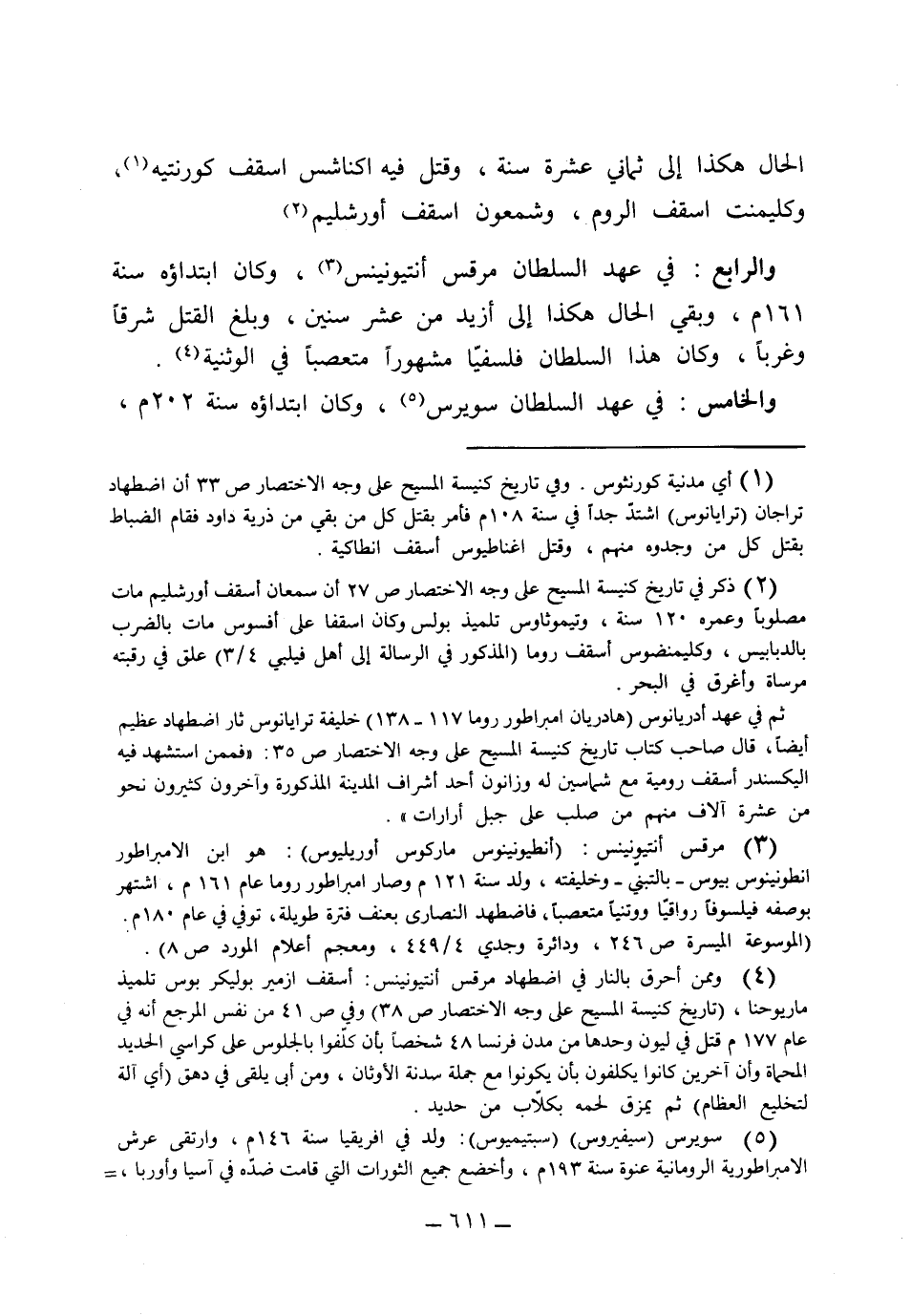 الحال هكذا إلى ثماني عشرة سنة، وقتل فيه إكناسش أسقف كورنتيه، وكليمنت أسقف الروم، وشمعون أسقف أورشليم (والرابع) في عهد السلطان مرقس أنتونيس وكان ابتداؤه سنة 161 وبقي الحال هكذا إلى أزيد من عشر سنين، وبلغ القتل شرقاً وغرباً وكان هذا السلطان فلسفياً مشهوراً متعصباً في الوثنية (والخامس) في عهد السلطان سويرس وكان ابتداؤه سنة 202