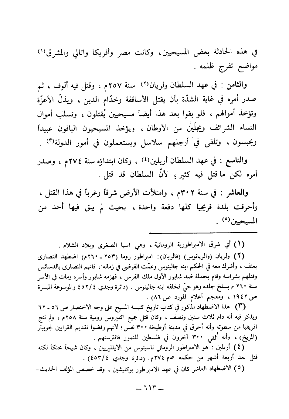 (والثامن) في عهد السلطان ولريان سنة 257 وقتل فيه ألوف، ثم صدر أمره في غاية الشدة بأن يقتل الأساقفة وخدام الدين، ويذل الأعزة وتؤخذ أموالهم، فلو بقوا بعد هذا أيضاً مسيحيين يقتلون، وتسلب أموال النساء الشرائف ويجلين من الأوطان، ويؤخذ المسيحيون الباقون عبيداً ويحبسون ويلقى في أرجلهم سلاسل ويستعملون في أمور الدولة (التاسع) في عهد السلطان أريلين وكان ابتداؤه سنة 274 وصدر أمره لكن ما قتل فيه كثير لأن السلطان قد قتل (والعاشر) في سنة 302 وامتلأت الأرض شرقاً وغرباً في هذا القتل وأحرقت بلدة فريجيا كلها دفعة واحدة بحيث لم يبق فيها أحد من المسيحيين.