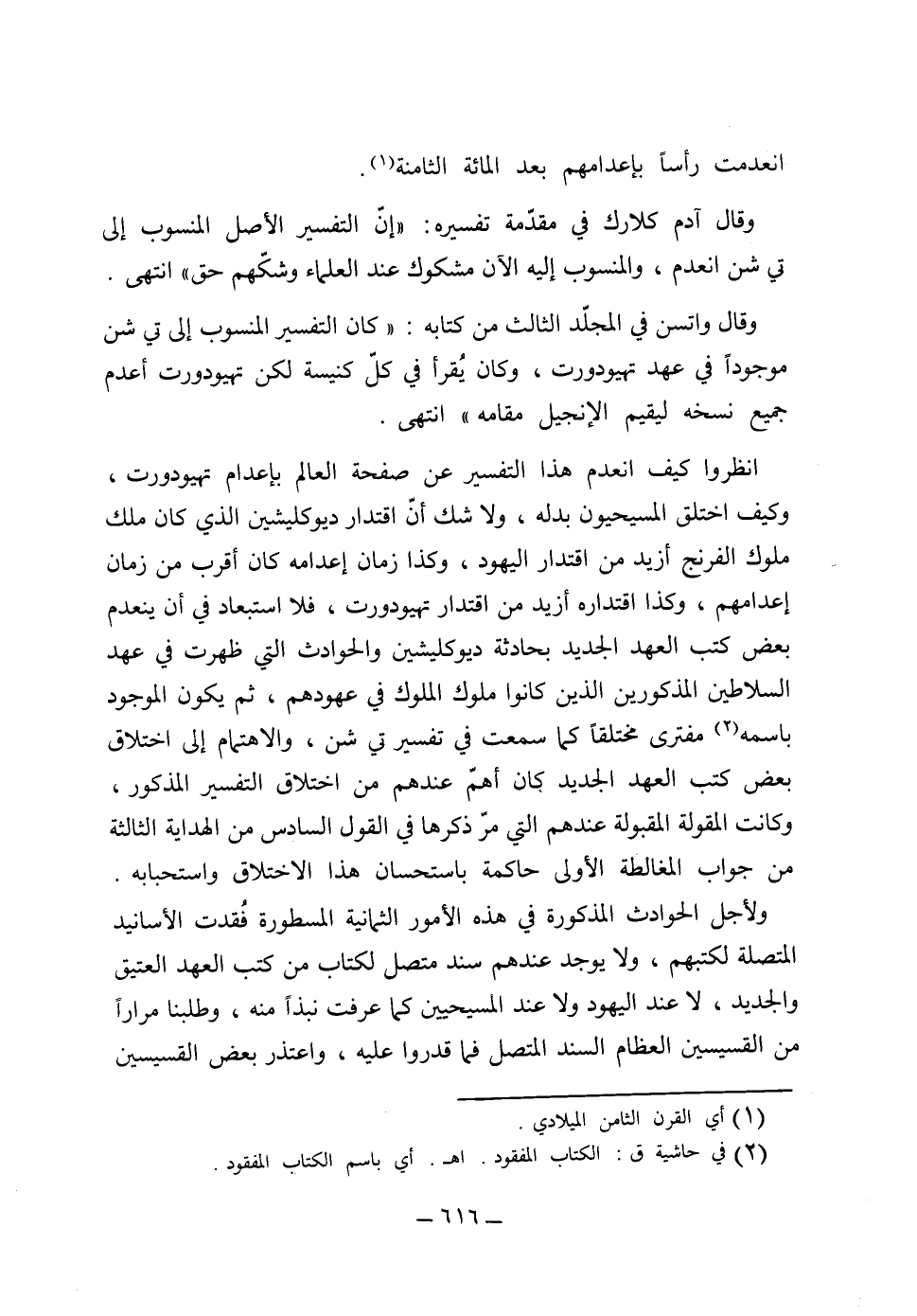 انعدمت رأساً بإعدامهم بعد المائة الثامنة، وقال آدم كلارك في مقدمة تفسيره: "إن أصل التفسير المنسوب إلى تي شن انعدم، والمنسوب إليه الآن مشكوك عند العلماء وشكهم حق" وقال واتسن في المجلد الثالث من كتابه: "كان التفسير المنسوب إلى تي شن موجوداً في عهد تهيودورت، وكان يقرأ في كل كنيسة، لكن تهيودورت أعدم جميع نسخه ليقيم الإنجيل مقامه" انظروا كيف انعدم هذا التفسير عن صفحة العالم بإعدام تهيودورت وكيف اخترع واختلق المسيحيون بدله، ولا شك أن اقتدار ديوكليشين الذي ملك ملوك الفرنج أزيد من اقتدار اليهود، وكذا زمان إعدامه كان أقرب من زمان إعدامهم، وكذا اقتداره أزيد من اقتدار تهيودورت، فلا استبعاد أن ينعدم بعض كتب العهد الجديد بحادثة ديوكليشين والحوادث التي ظهرت في عهد السلاطين المذكورين الذين كانوا ملوك الملوك في عهدهم، ثم يكون الموجود باسمه مختلقاً كما سمعت في تفسير تي شن، والاهتمام إلى