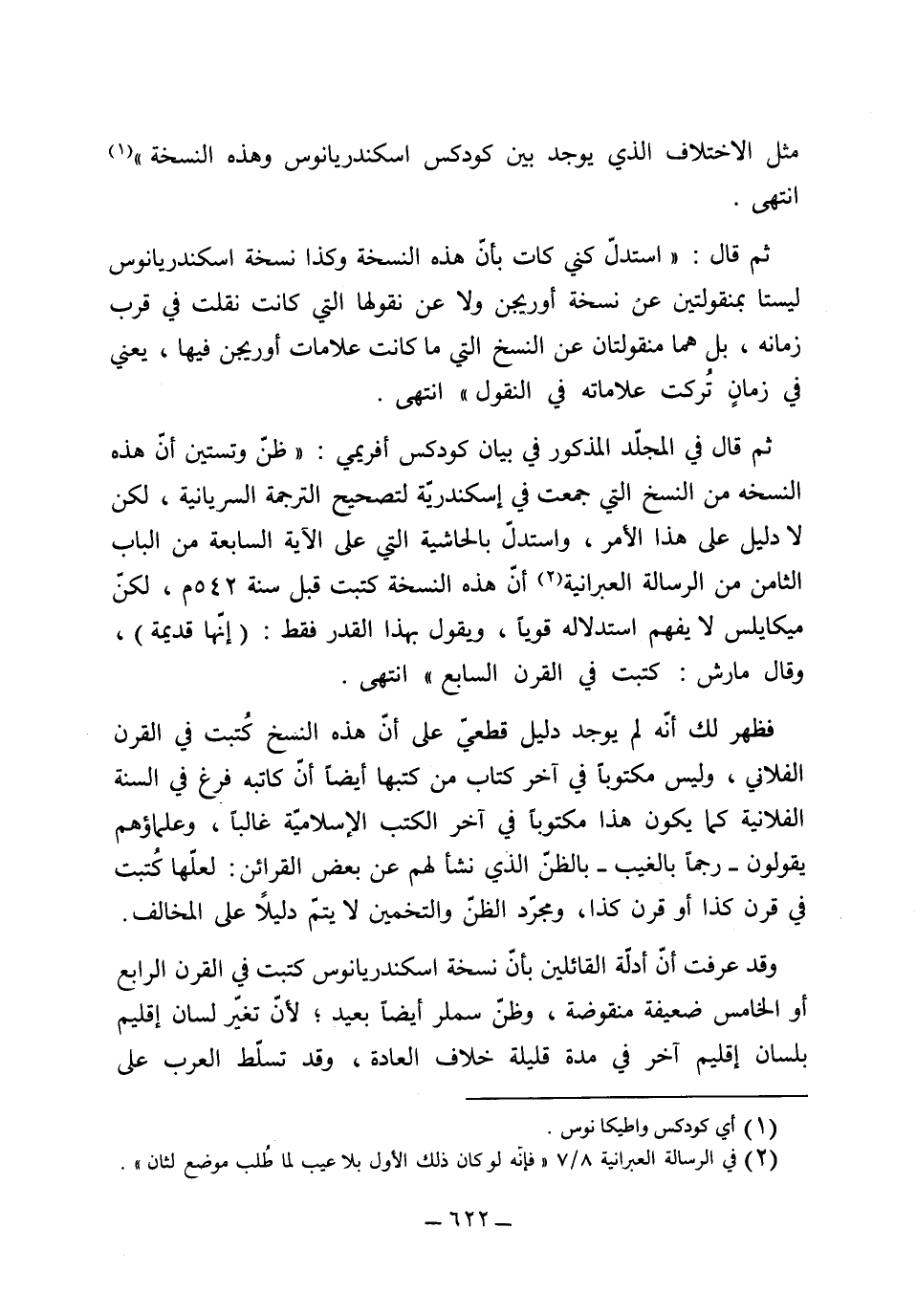 فظهر لك أنه لم يوجد دليل قطعي على أن هذه النسخ كتبت في القرن الفلاني وليس مكتوباً في آخر كتاب من كتبها أيضاً أن كاتبه فرغ في السنة الفلانية كما يكون هذا مكتوباً في آخر الكتب الإسلامية غالباً، وعلماؤهم يقولون رجماً بالغيب بالظن الذي نشأ لهم عن بعض القرائن لعلها كتبت في قرن كذا أو قرن كذا، ومجرد الظن والتخمين لا يتم دليلاً على المخالف، وقد عرفت أن أدلة القائلين بأن نسخة اسكندر يانوس كتبت في القرن الرابع أو الخامس ضعيفةٌ منقوضة، وظنُّ سِمْلر أيضاً بعيدٌ لأن تغير لسان إقليم بلسان إقليم آخر في مدة قليلة خلاف العادة، وقد تسلط العرب على