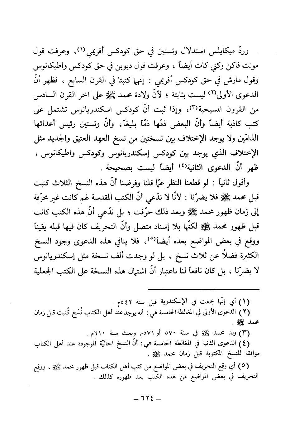 كتب كاذبة أيضاً، وأن البعض ذمّها ذماً بليغاً وأن وتستين رئيس أعدائه الذّامِّين، ولا يوجد الاختلاف بين نسختين من نسخ العهد العتيق والجديد مثل الاختلاف الذي يوجد بين كودكس واطيكانوس - ظهر أن الدعوى الثانية أيضاً ليست بصحيحة، وأقول ثانياً: لو قطعنا النظر عما قلنا وفرضنا أن هذه النسخ الثلاث كتبت قبل محمد صلى الله عليه وسلم فلا يضرنا لأنا لا ندعي أن الكتب المقدسة لهم كانت غير محرفة إلى زمان ظهور محمد صلى الله عليه وسلم وبعد ذلك حرفت، بل ندعي أن هذه الكتب كانت قبل ظهور محمد صلى الله عليه وسلم لكنها بلا إسناد متصل وأن التحريف كان فيها قبله يقيناً ووقع في بعض المواضع بعده أيضاً، فلا ينافي هذه الدعوى وجود النسخ الكثيرة فضلاً عن ثلاث نسخ، بل لو وجدت ألف نسخة مثل اسكندر يانوس لا يضرنا بل كان نافعاً لنا باعتبار أن اشتمال هذه النسخ على الكتب الجعلية