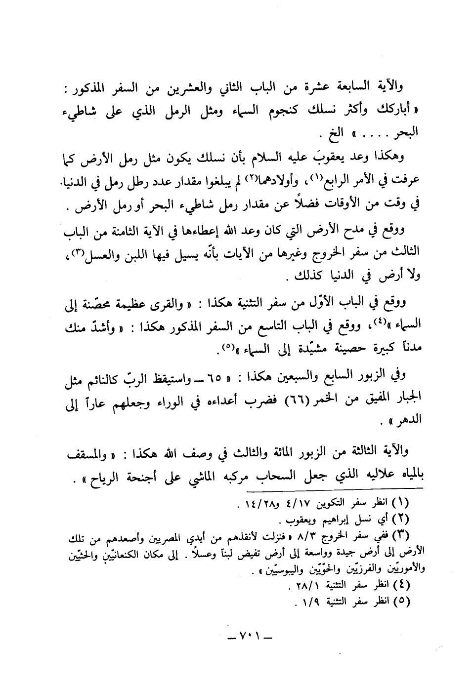 والآية السابعة عشرة من الباب الثاني والعشرين من السفر المذكور: "أباركك وأكثر نسلك كنجوم السماء ومثل الرمل الذي على شاطئ البحر الخ" وهكذا وعد يعقوب عليه السلام بأن نسلك يكون مثل رمل الأرض كما عرفت في الأمر الرابع، وأولادهما لم يبلغ مقدارهم عدد رطل رمل في الدنيا في وقت من الأوقات فضلاً عن مقدار رمل شاطئ البحر أو رمل الأرض، ووقع في مدح الأرض التي كان وعد الله إعطاءها في الآية الثامنة من الباب الثالث من سفر الخروج وغيرها من الآيات بأنه يسيل فيها اللبن والعسل ولا أرض في الدنيا كذلك، ووقع في الباب الأول من سفر الاستثناء هكذا: "والقرى عظيمة محصّنة إلى السماء" ووقع في الباب التاسع من السفر المذكور هكذا: "وأشد منك مدناً كبيرة حصينة مشيدة إلى السماء" وفي الزبور السابع والسبعين هكذا: 65: "واستيقظ الرب كالنائم مثل الجبار المفيق من الخمر 66 فضرب أعداءه في الوراء وجعلهم عاراً إلى الدهر"، والآية الثالثة من الزبور المائة والثالث في وصف الله هكذا: "والمسقف بالمياه علاليه الذي جعل السحاب مركبه الماشي على أجنحة الرياح".