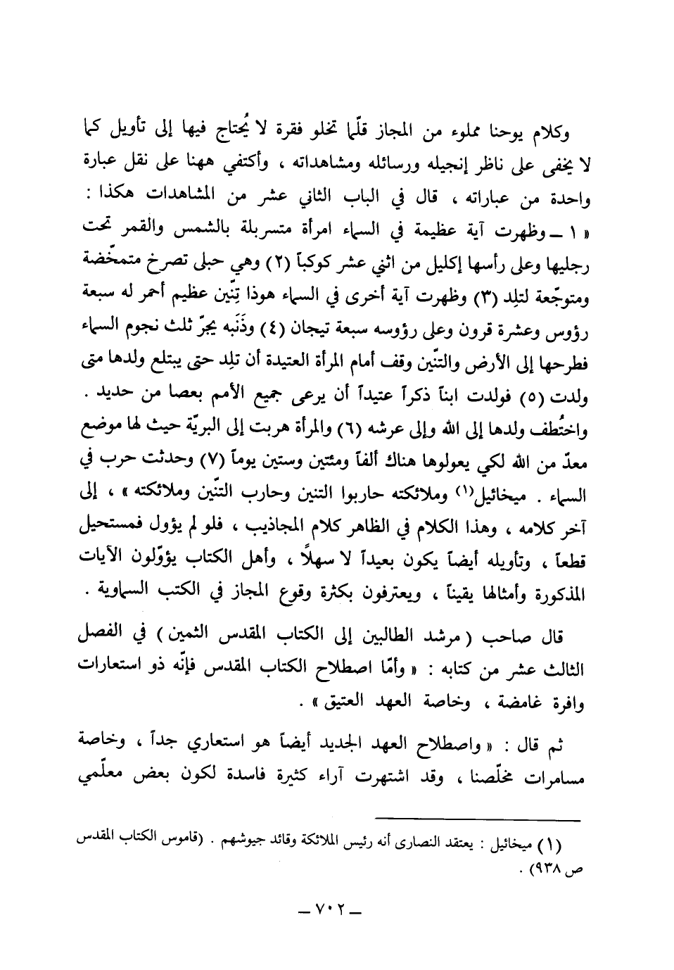إكليل من اثني عشر كوكباً 2 وهي حبلى تصرخ متمخضة ومتوجعة لتلده 3 وظهرت آية أخرى في السماء هو ذا تنين عظيم أحمر له سبعة رؤوس وعشرة قرون، وعلى رؤوسه سبعة تيجان 4 وذنبه يجر ثلث نجوم السماء، فطرحها إلى الأرض، والتنين وقف أمام المرأة العتيدة أن تلد حتى يبتلع ولدها متى ولدت 5 فولدت ابناً ذكراً أن يرعى جميع الأمم بعصى من حديد واختطف ولدها إلى الله وإلى عرشه 6 والمرأة هربت إلى البرية حيث لها موضع معد من الله لكي يعولوها هناك ألفاً ومائتين وستين يوماً 7 وحدثت حرب في السماء ميخائيل وملائكته حاربوا التنين وحارب التنين وملائكته" إلى آخر كلامه وهذا الكلام في الظاهر كلام المجاذيب فلو لم يؤول فمستحيل قطعاً، وتأويله أيضاً يكون بعيداً لا سهلاً وأهل الكتاب يؤوّلون الآيات المذكورة وأمثالها يقيناً ويعترفون بكثرة وقوع المجاز في الكتب السماوية قال صاحب (مرشد الطالبين إلى الكتاب المقدس الثمين) في الفصل الثالث عشر من كتابه: "وأما اصطلاح الكتاب المقدس فإنه ذو استعارات وافرة غامضة وخاصة العهد العتيق" ثم قال: "واصطلاح العهد الجديد أيضاً هو استعاري جداً وخاصة مسامرات مخلصنا وقد اشتهرت آراء كثيرة فاسدة لكون بعض معلمي